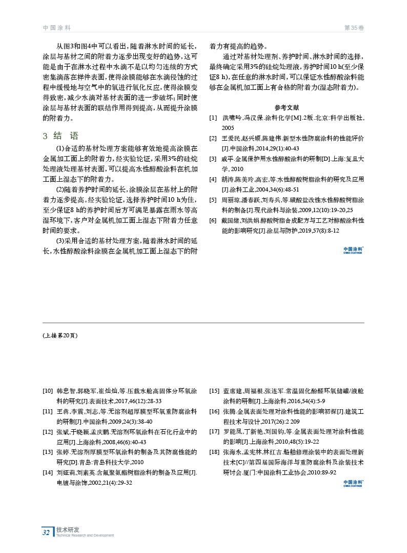 摘要:以自制的水性醇酸涂料為涂層,金屬機加工面為基材,討論了基材處理劑、養護時間、淋水時間對涂層在金屬加工面上濕態下附著力的影響。采用濃度為3%的硅烷處理液處理基材能夠有效地提高涂層在金屬加工面上的附著力;隨著養護時間和淋水時間的延長,能夠在一定程度上改善水性醇酸涂料在金屬加工面上的濕態附著力較差的現象。