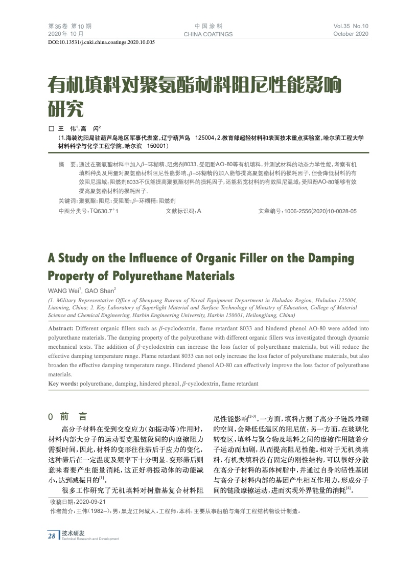 摘要:通過在聚氨酯材料中加入β−環糊精、阻燃劑8033、受阻酚AO-80等有機填料,并測試材料的動態力學性能,考察有機填料種類及用量對聚氨酯材料阻尼性能影響。β−環糊精的加入能夠提高聚氨酯材料的損耗因子,但會降低材料的有效阻尼溫域;阻燃劑8033不僅能提高聚氨酯材料的損耗因子,還能拓寬材料的有效阻尼溫域;受阻酚AO-80能夠有效提高聚氨酯材料的損耗因子。