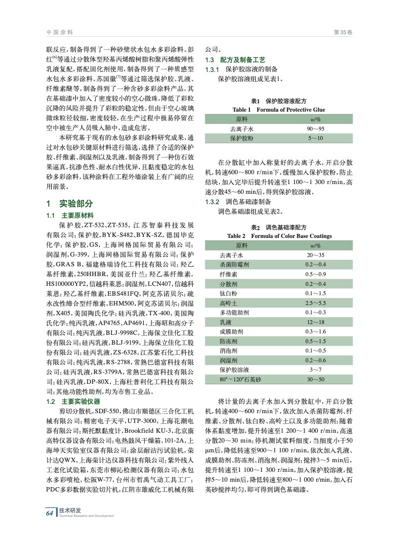 從保護膠、纖維素、潤濕劑以及乳液入手,通過篩選不同的原材料以及對原材料用量的調整,制備得到了一種仿石效果逼真,抗滲色性、耐水白性優異,并且黏度穩定的水包砂多彩涂料。
