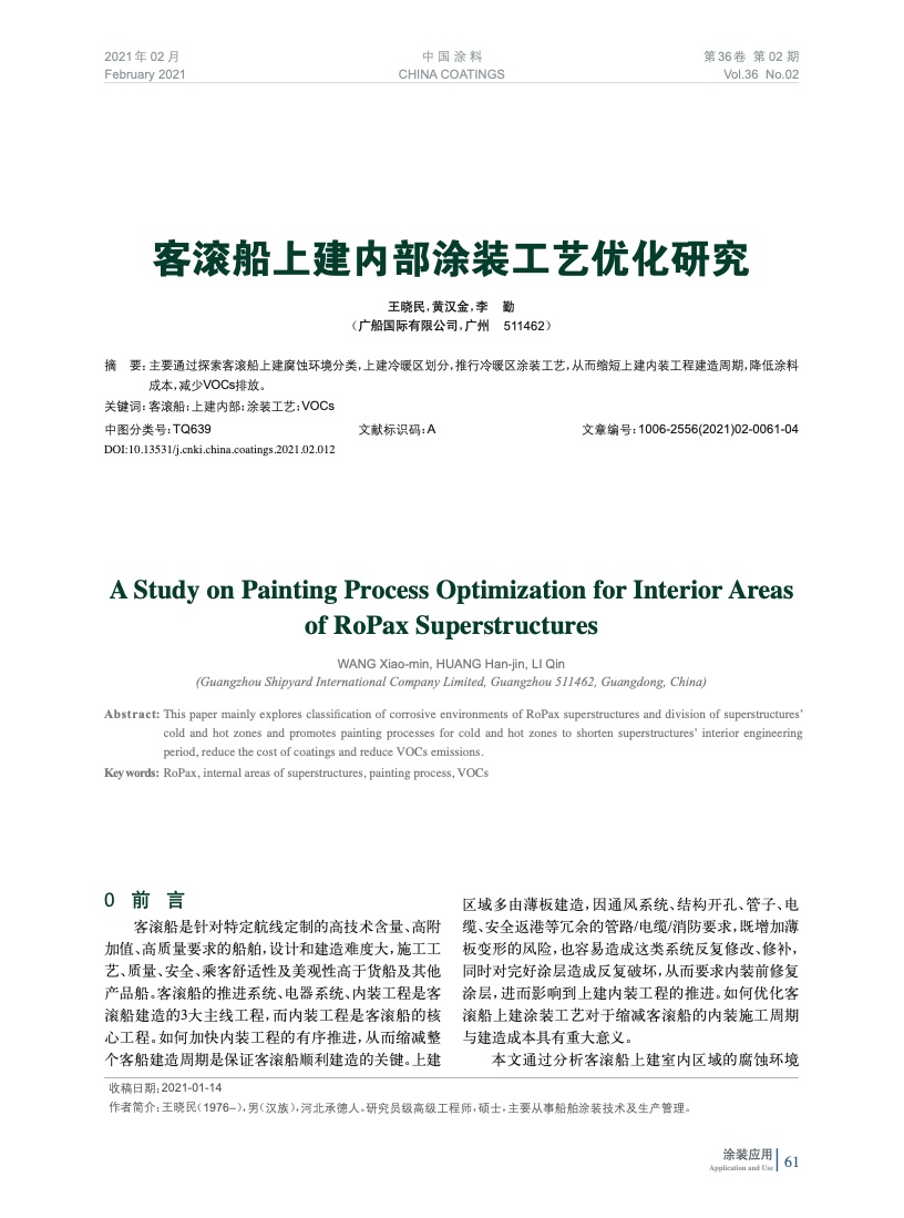 主要通過探索客滾船上建腐蝕環境分類,上建冷暖區劃分,推行冷暖區涂裝工藝,從而縮短上建內裝工程建造周期,降低涂料成本,減少VOCs排放。