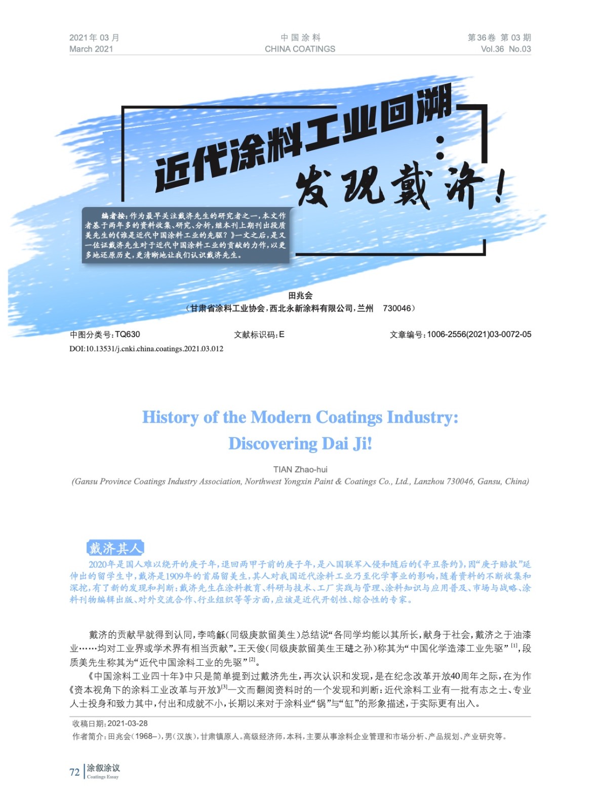 編者按:作為最早關注戴濟先生的研究者之一,本文作者基于兩年多的資料收集、研究、分析,繼本刊上期刊出段質美先生的《誰是近代中國涂料工業的先驅?》一文之后,是又一佐證戴濟先生對于近代中國涂料工業的貢獻的力作,以更多地還原歷史,更清晰地讓我們認識戴濟先生。