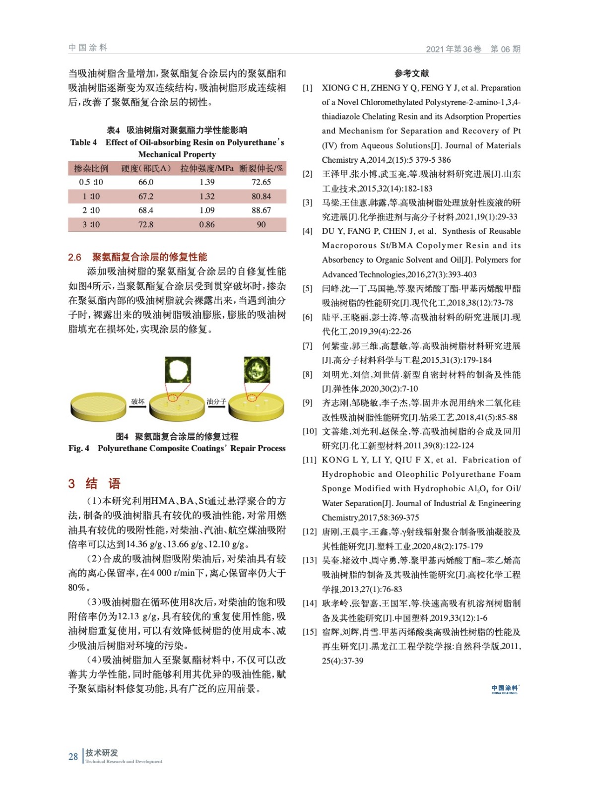 摘要:以甲基丙酸酸十六烷基酯、丙烯酸丁酯、苯乙烯為聚合單體,采用懸浮聚合的方法合成了一種丙烯酸酯類高吸油樹脂,并制備了吸油樹脂/聚氨酯復(fù)合涂層。測試結(jié)果表明當(dāng)單體配比為10∶1∶1時,吸油樹脂對柴油的吸附倍率最高,飽和吸附倍率為14.36 g/g;高吸油樹脂對柴油具有較優(yōu)的保留率,循環(huán)使用8次后對柴油飽和吸附倍率仍大于12 g/g;添加高吸油樹脂的聚氨酯復(fù)合涂層具有良好的修復(fù)性能。
