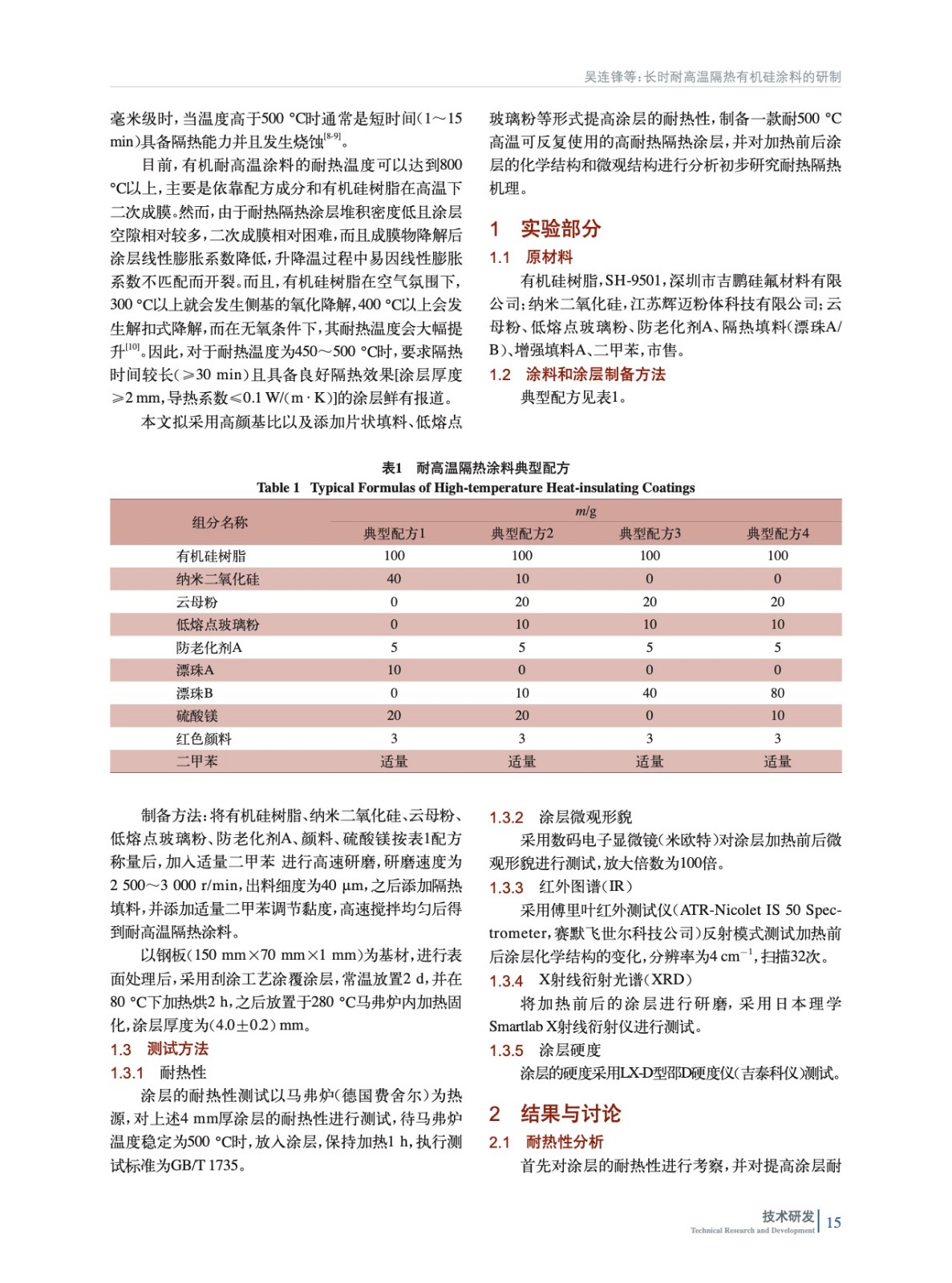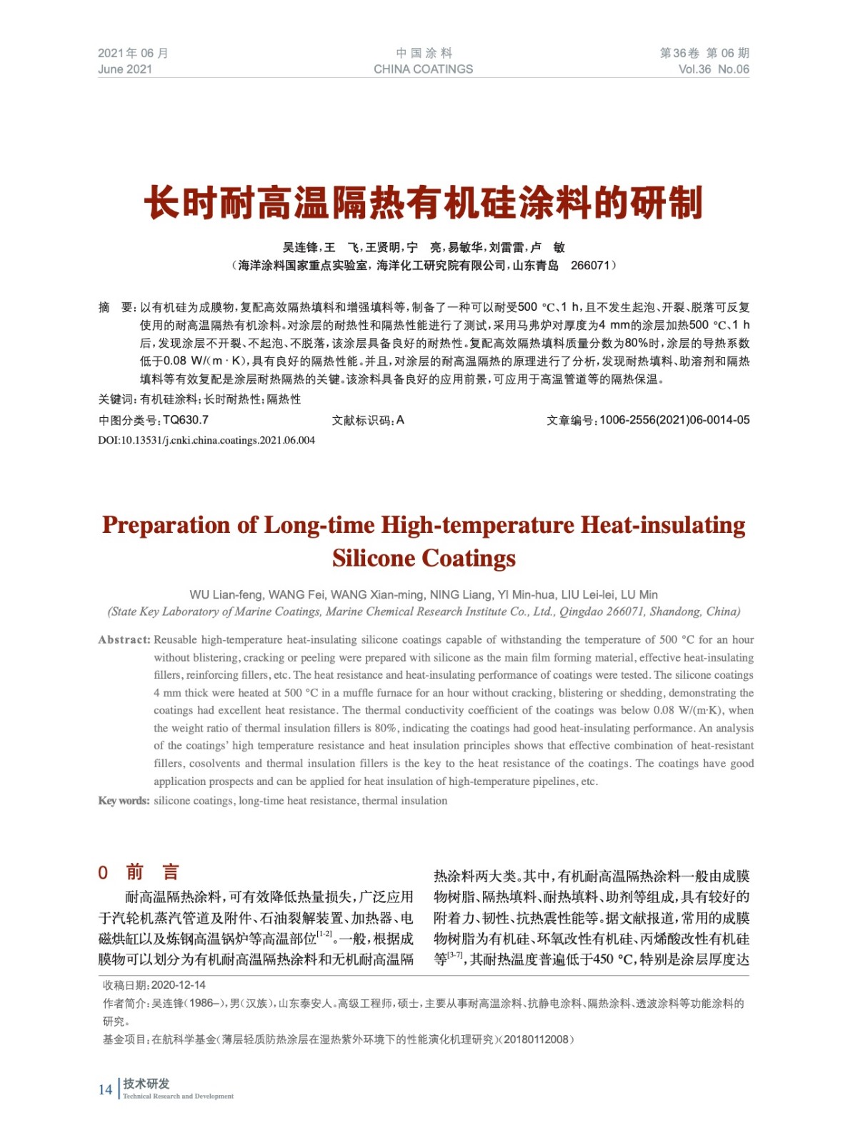 摘要:以有機硅為成膜物,復配高效隔熱填料和增強填料等,制備了一種可以耐受500 ℃、1 h,且不發(fā)生起泡、開裂、脫落可反復使用的耐高溫隔熱有機涂料。對涂層進行測試,發(fā)現(xiàn)該涂層具備良好的耐熱性。復配高效隔熱填料質(zhì)量分數(shù)為80%時,涂層具有良好的隔熱性能。并且,對涂層的耐高溫隔熱的原理進行了分析,發(fā)現(xiàn)耐熱填料、助溶劑和隔熱填料等有效復配是涂層耐熱隔熱的關鍵。