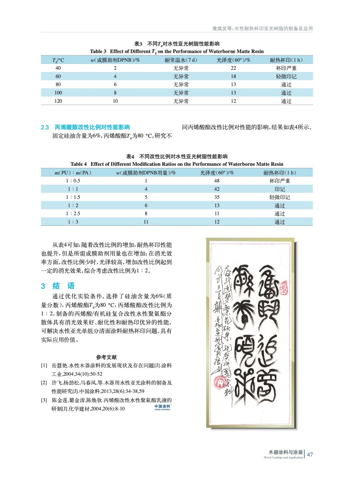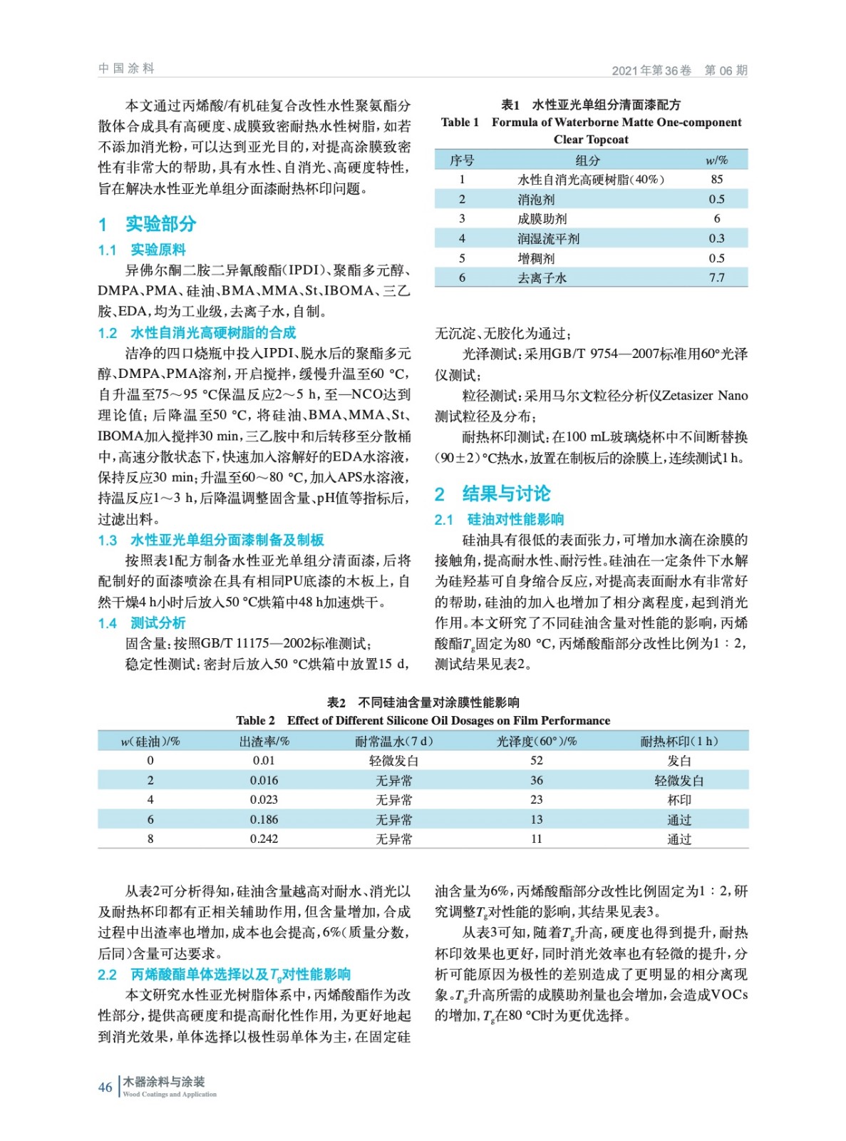 摘要:采用丙烯酸/有機硅復合改性水性聚氨酯分散體,研究了自消光機理、硅油使用量、丙烯酸酯改性比例及玻璃化轉變溫度對涂膜性能尤其是耐熱杯印的影響,解決家具耐熱杯印問題。結果表明:硅油用量為6%,改性比例為1∶2,丙烯酸酯部分玻璃化轉變溫度為80 ℃合成的水性亞光聚氨酯分散體綜合性能最佳。