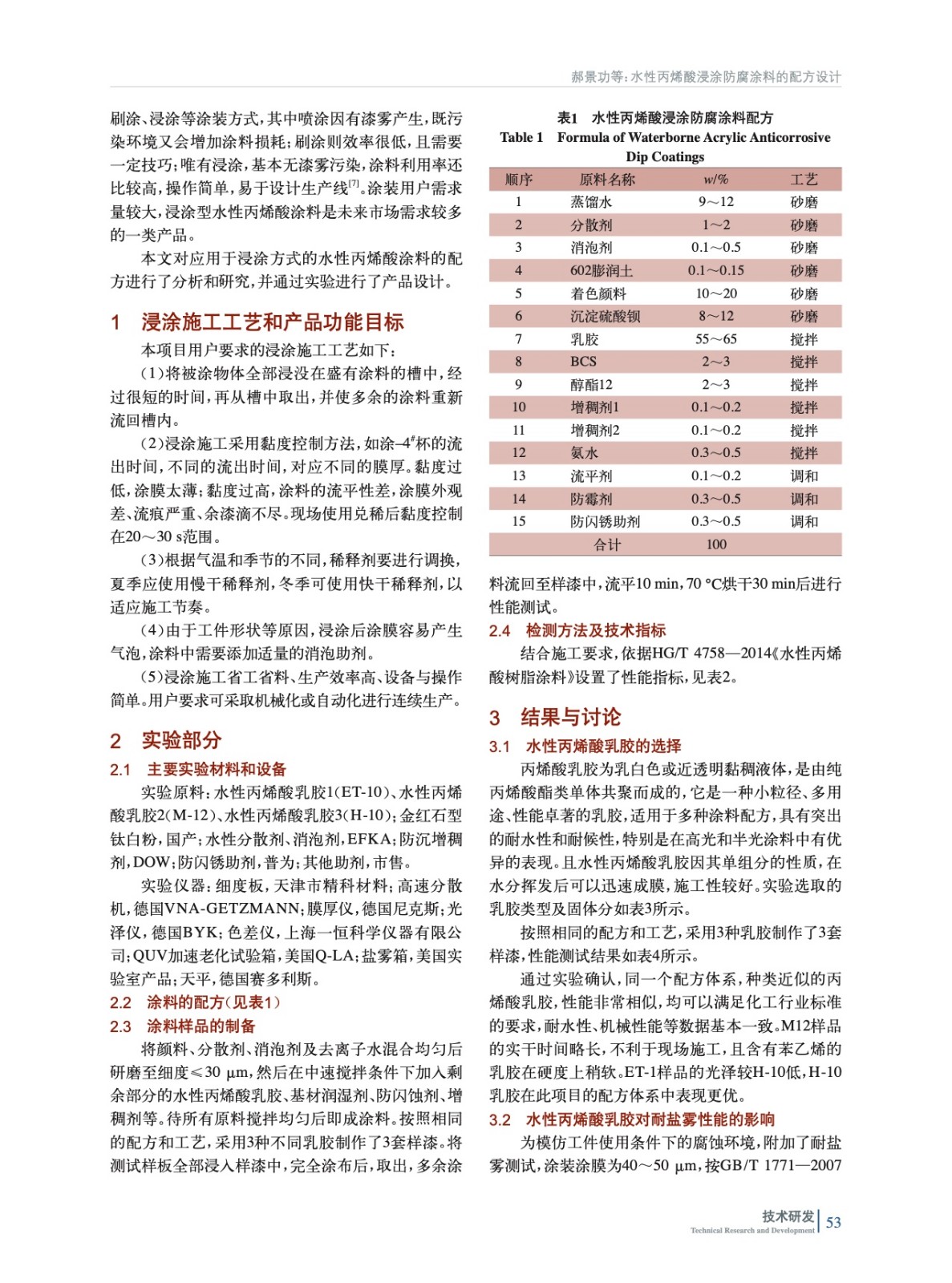 使用水性丙烯酸乳膠為原料,制成了符合化工行業標準的浸涂防腐涂料,經檢測,產品的干燥性、施工性、防腐性等均符合要求,并對配方結構和原料等進行了分析和討論。