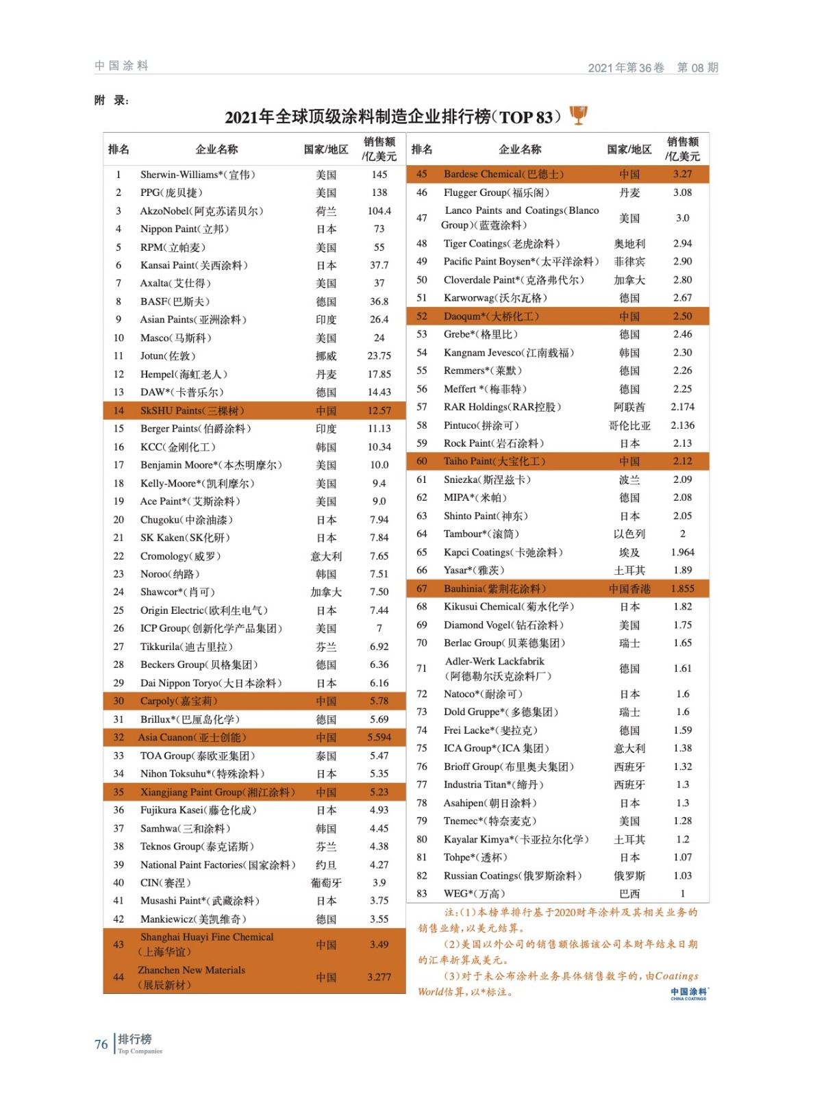 2021年全球頂級涂料制造企業(yè)排行榜(TOP 83)