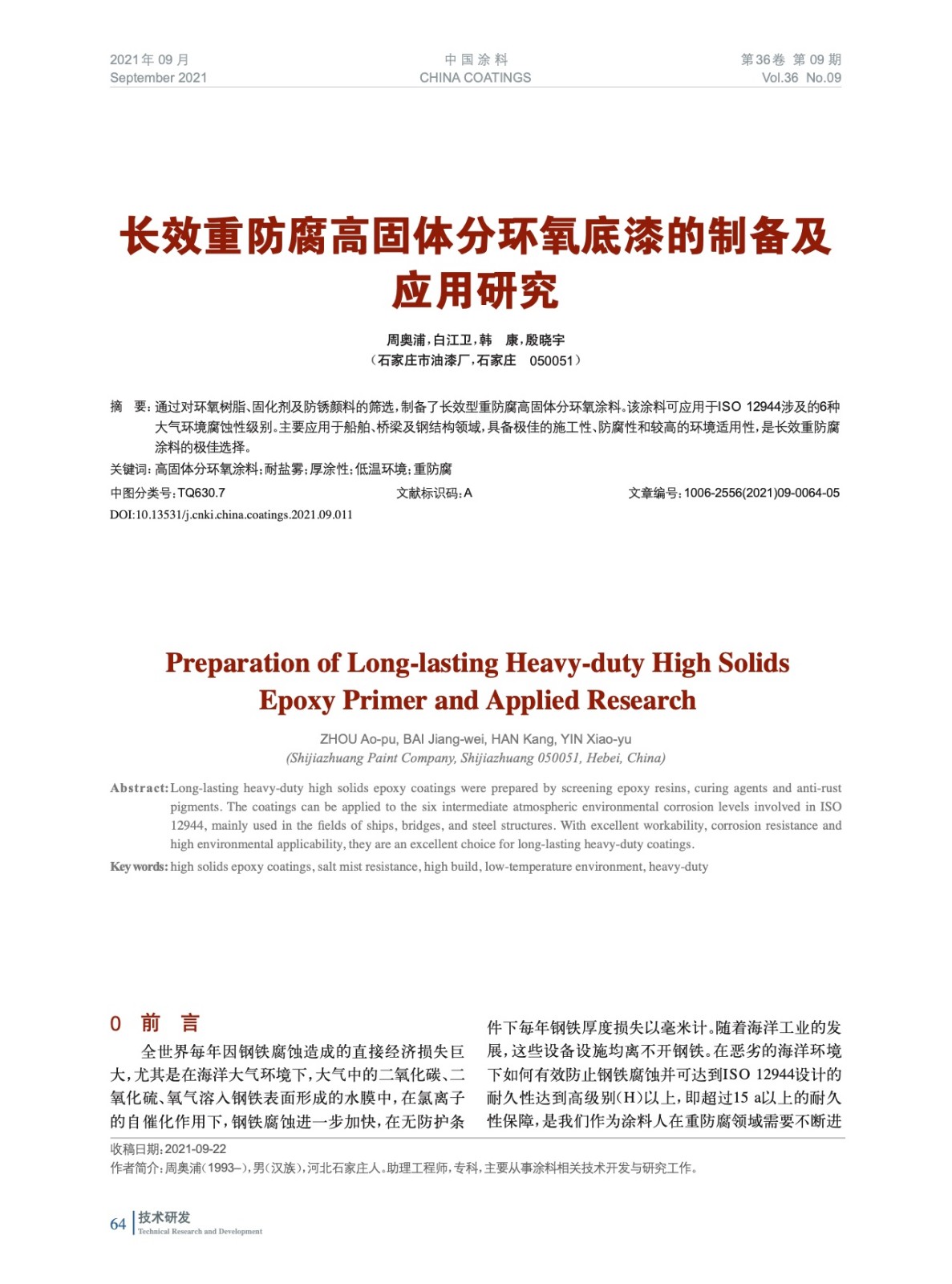 長效重防腐高固體分環氧底漆的制備及應用研究
