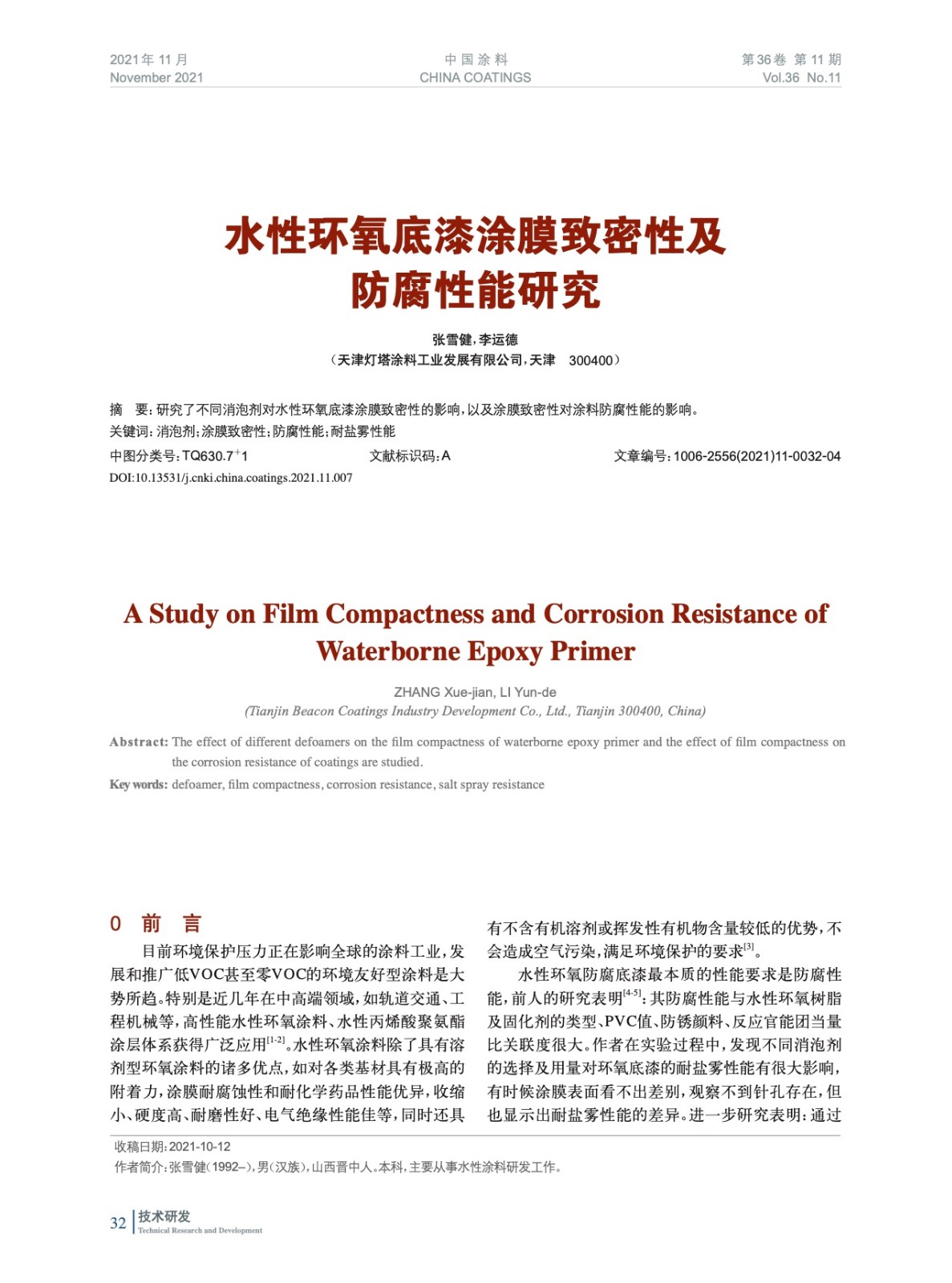 研究了不同消泡劑對水性環氧底漆涂膜致密性的影響,以及涂膜致密性對涂料防腐性能的影響。