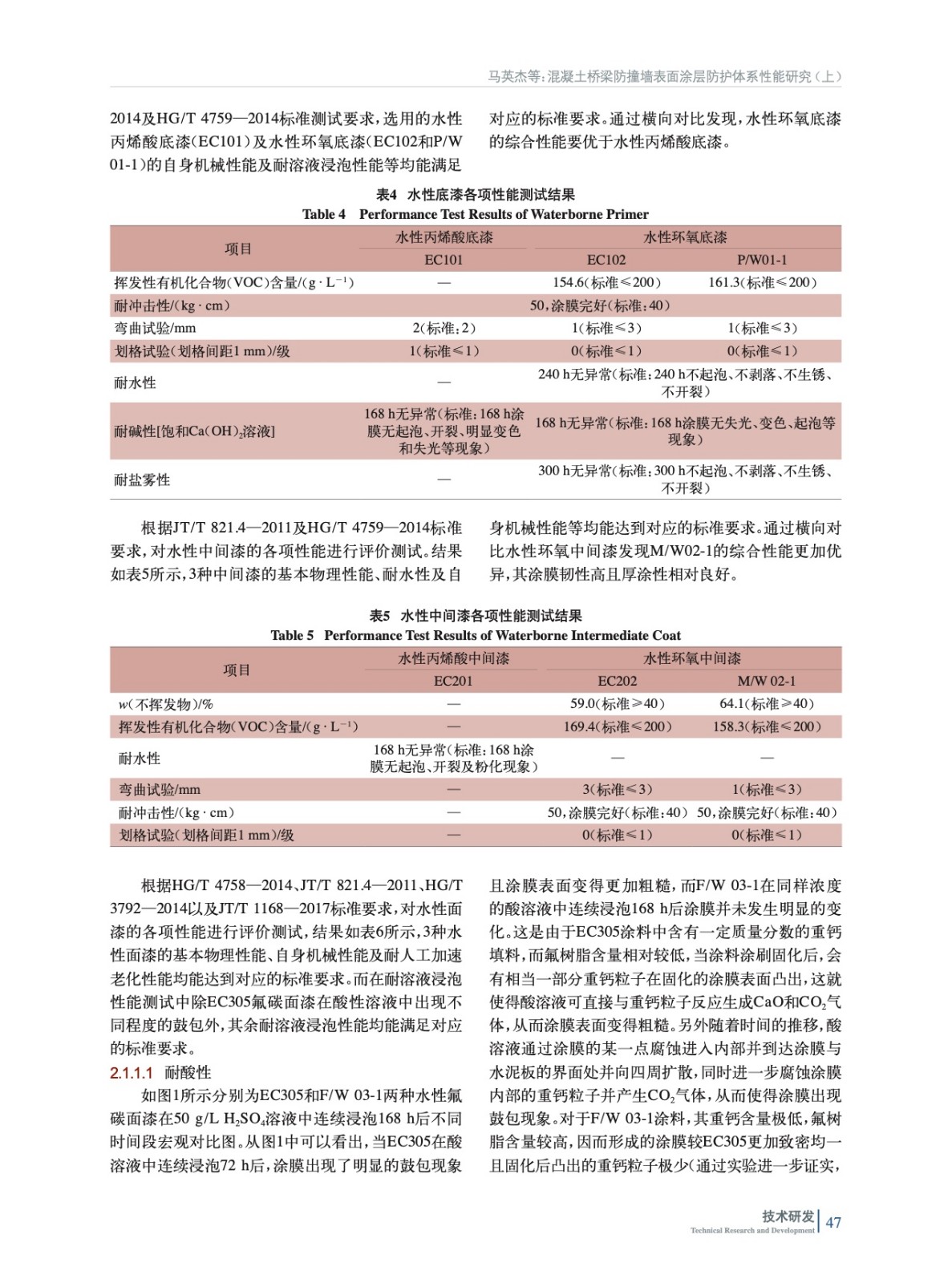 摘要:針對混凝土橋梁防撞墻極易受外界復雜腐蝕環境影響并造成嚴重損傷問題,本研究以“底漆+中間漆+面漆”的復合涂層體系作為設計方案,分別采用3種水性和3種高固體分溶劑型混凝土表面復合防護涂層體系,根據相應標準分別對它們進行了系統性評價研究。