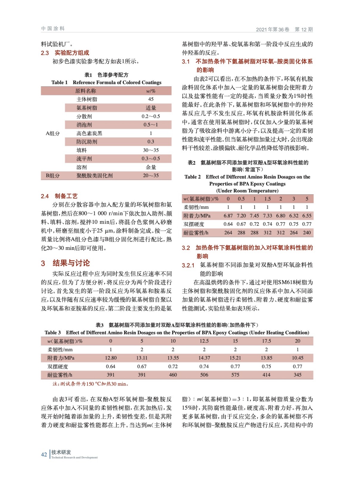 通過高溫烘烤的方式,使氨基樹脂中的羥甲基或烷氧基參與環氧有機胺涂料固化反應,并對于氨基樹脂在環氧–胺類反應體系中對涂料的理化性能的影響進行了討論。結果表明,在一定條件下,使用氨基樹脂參與環氧–胺類反應體系可以使其防腐性能更加優異。