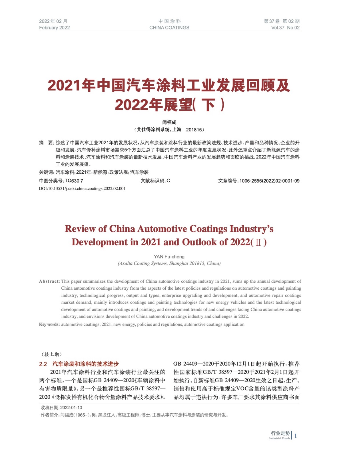 摘要:綜述了中國(guó)汽車工業(yè)2021年的發(fā)展?fàn)顩r,從汽車涂裝和涂料行業(yè)的最新政策法規(guī)、技術(shù)進(jìn)步、產(chǎn)量和品種情況、企業(yè)的升級(jí)和發(fā)展、汽車修補(bǔ)涂料市場(chǎng)需求5個(gè)方面匯總了中國(guó)汽車涂料工業(yè)的年度發(fā)展?fàn)顩r,此外還重點(diǎn)介紹了新能源汽車的涂料和涂裝技術(shù)、汽車涂料和汽車涂裝的最新技術(shù)發(fā)展、中國(guó)汽車涂料產(chǎn)業(yè)的發(fā)展趨勢(shì)和面臨的挑戰(zhàn),2022年中國(guó)汽車涂料工業(yè)的發(fā)展展望。
