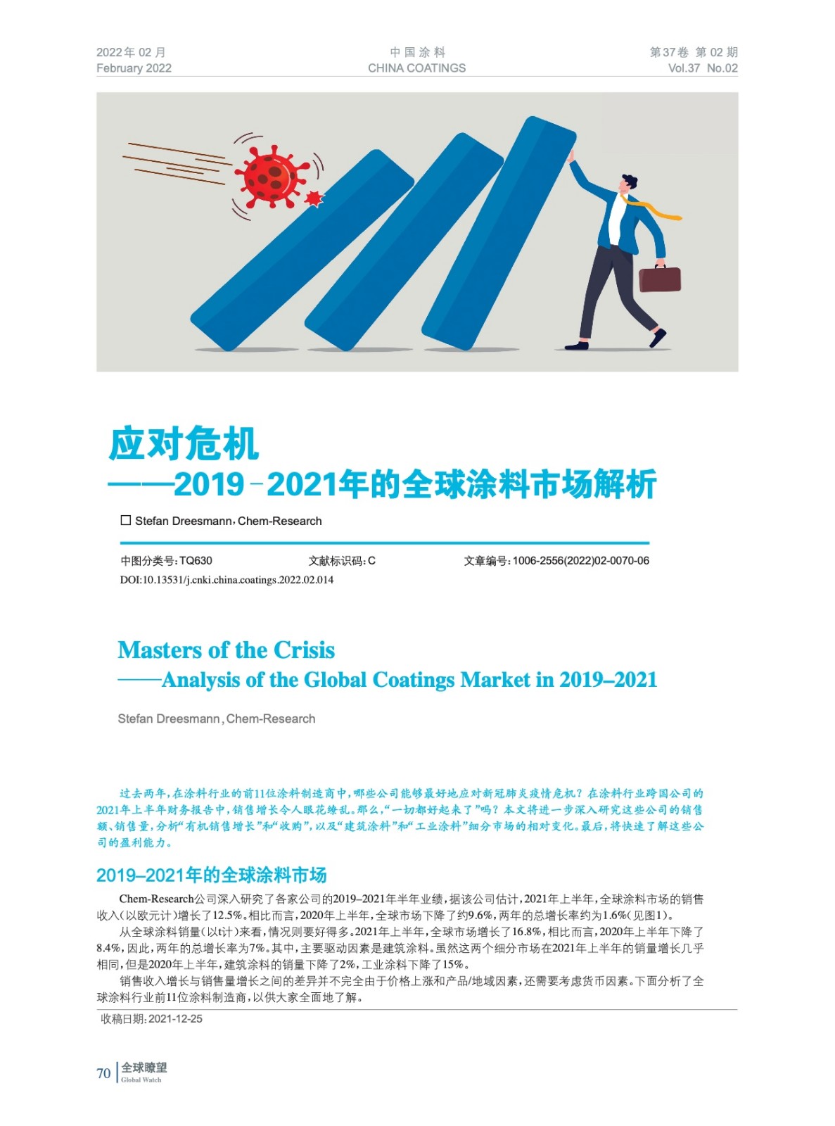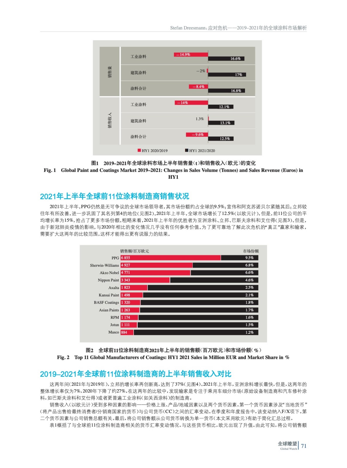 摘要:編者按:過去兩年,在涂料行業的前11位涂料制造商中,哪些公司能夠最好地應對新冠肺炎疫情危機?在涂料行業跨國公司的2021年上半年財務報告中,銷售增長令人眼花繚亂。那么,“一切都好起來了”嗎?本文將進一步深入研究這些公司的銷售額、銷售量,分析“有機銷售增長”和“收購”,以及“建筑涂料”和“工業涂料”細分市場的相對變化。最后,將快速了解這些公司的盈利能力。