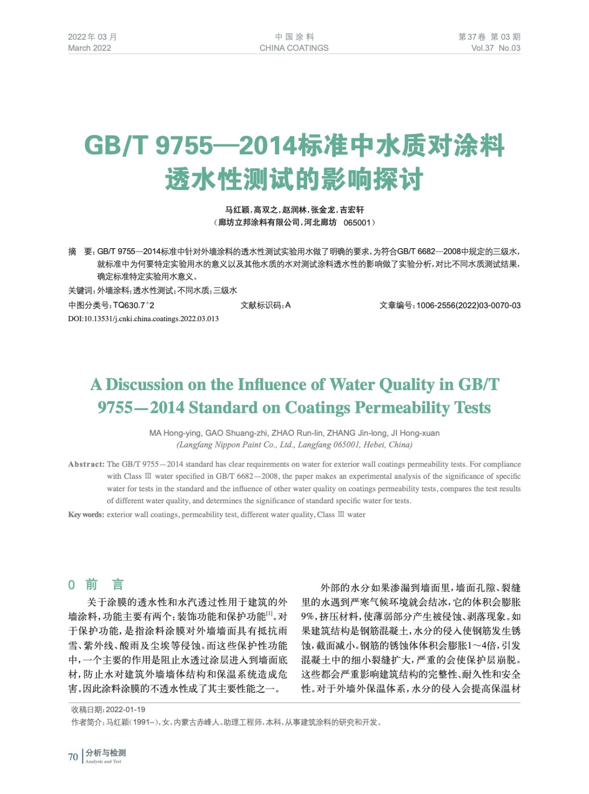 發(fā)表于2022-04-28 14:28:49| 次閱讀| 來源中國涂料| 作者馬紅穎,高雙之,趙潤林,張金龍,吉宏軒