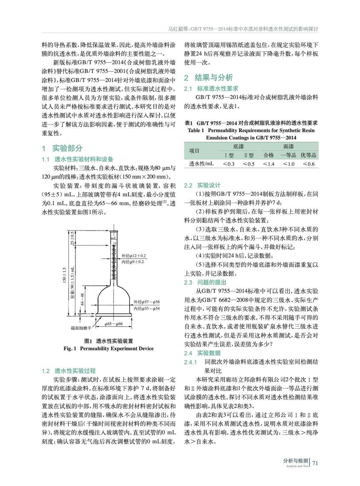 摘要:GB/T 9755—2014標準中針對外墻涂料的透水性測試實驗用水做了明確的要求,為符合GB/T 6682—2008中規(guī)定的三級水,就標準中為何要特定實驗用水的意義以及其他水質(zhì)的水對測試涂料透水性的影響做了實驗分析,對比不同水質(zhì)測試結(jié)果,確定標準特定實驗用水意義。