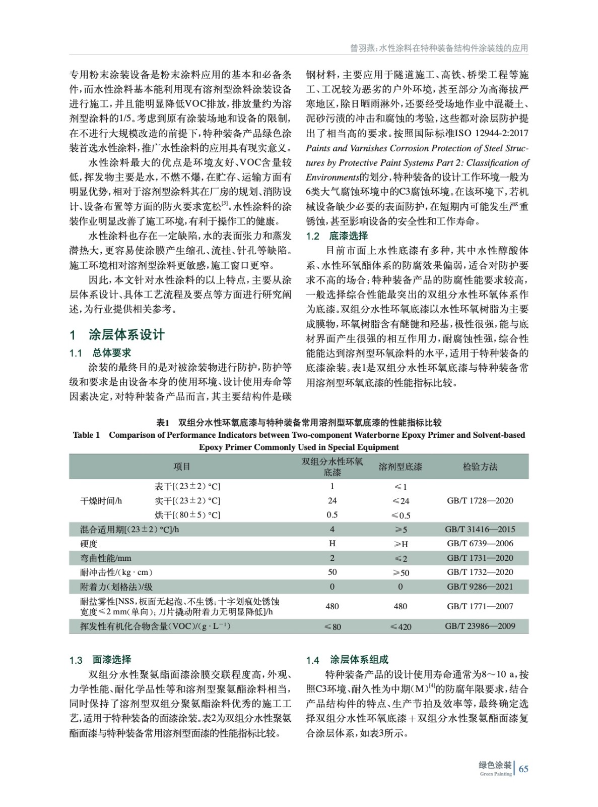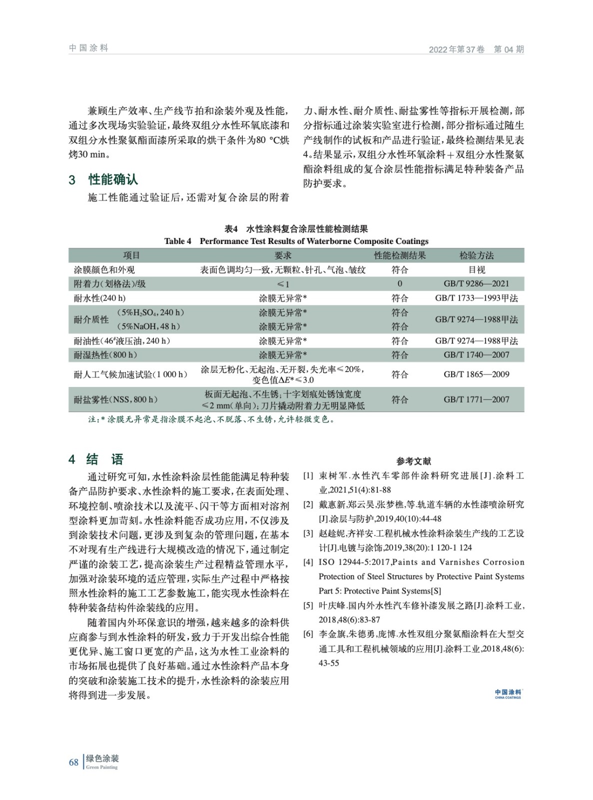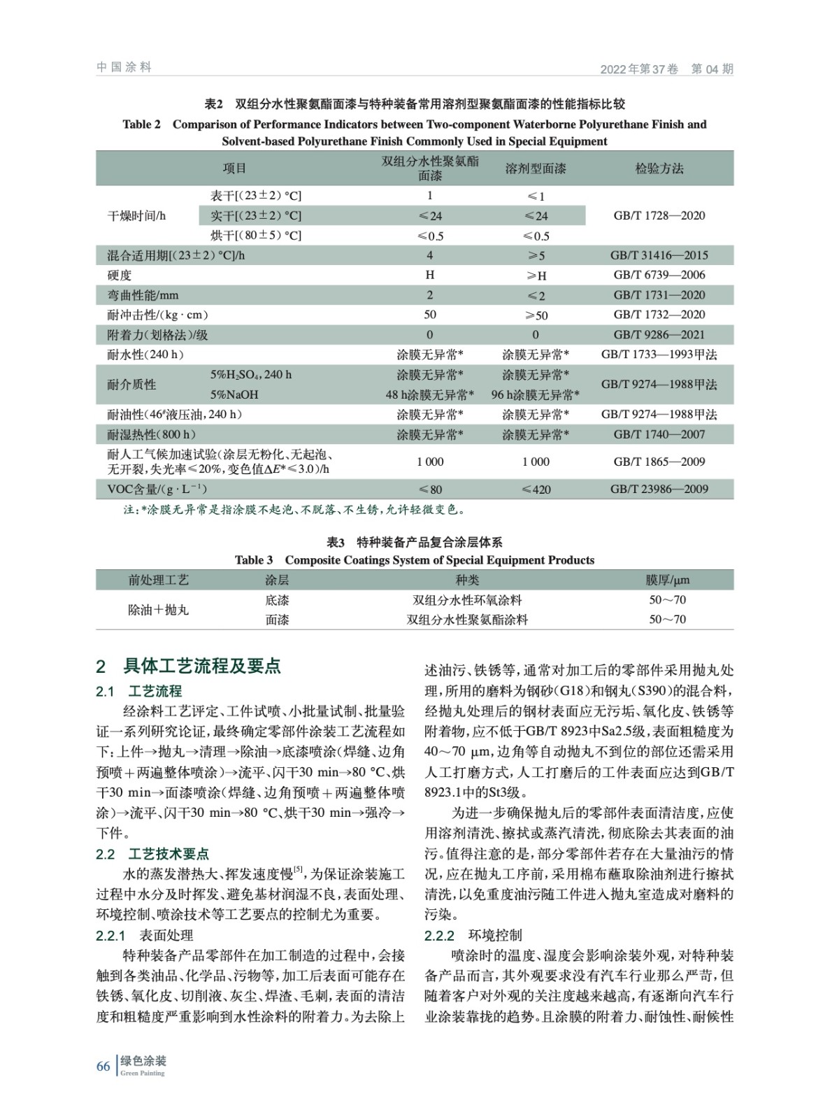摘要:介紹了水性涂料選型、涂層體系設計、具體工藝流程,重點探討了表面處理、環境控制、噴涂技術、流平、閃干及烘烤等工藝要點,并通過實驗室檢測、隨生產線制板實驗和產品驗證對復合涂層的性能指標進行了確認。結果表明,雙組分水性環氧涂料+雙組分水性聚氨酯涂料組成的復合涂層性能指標滿足特種裝備產品要求,可在特種裝備結構件涂裝線上推廣應用。