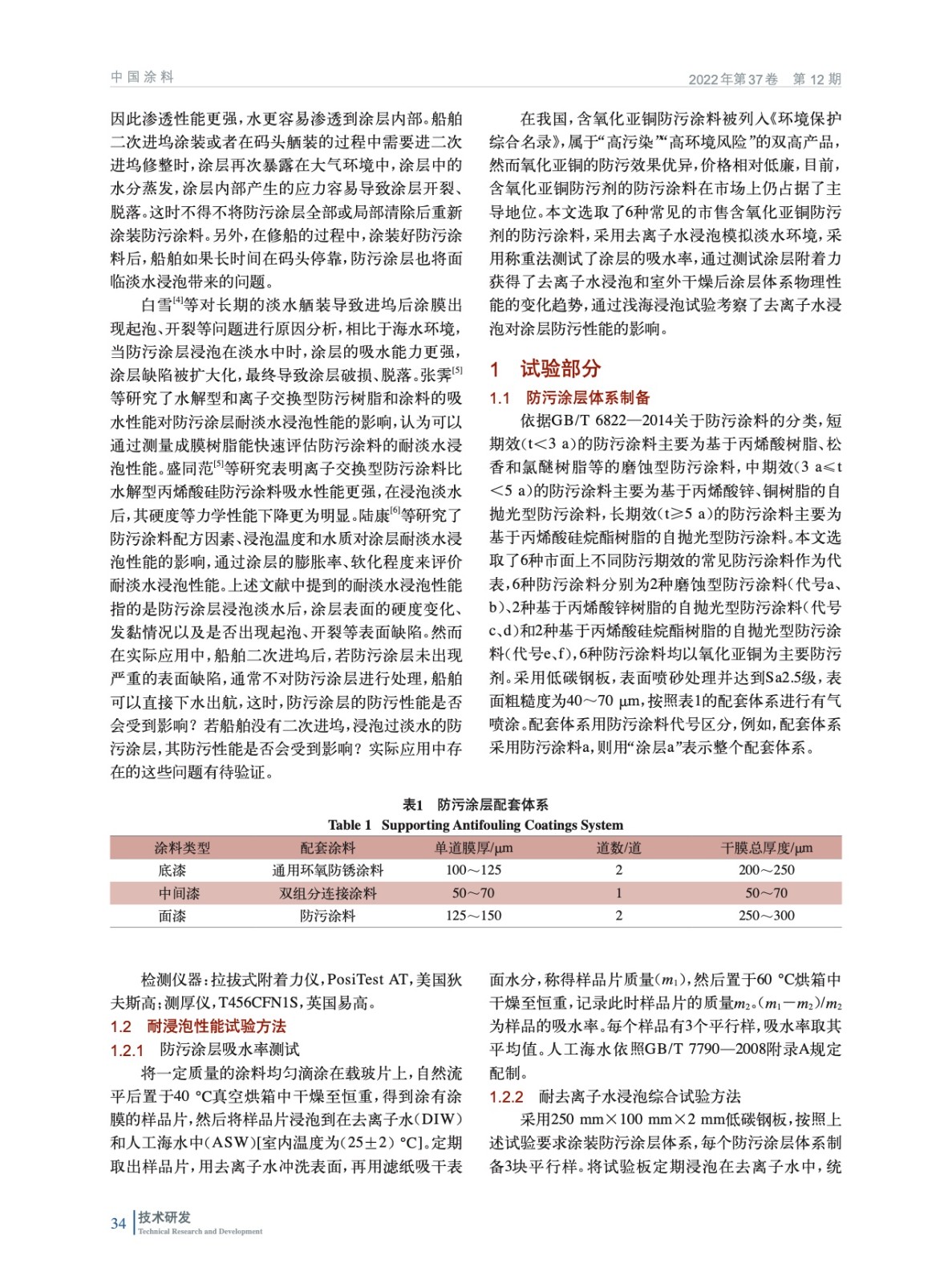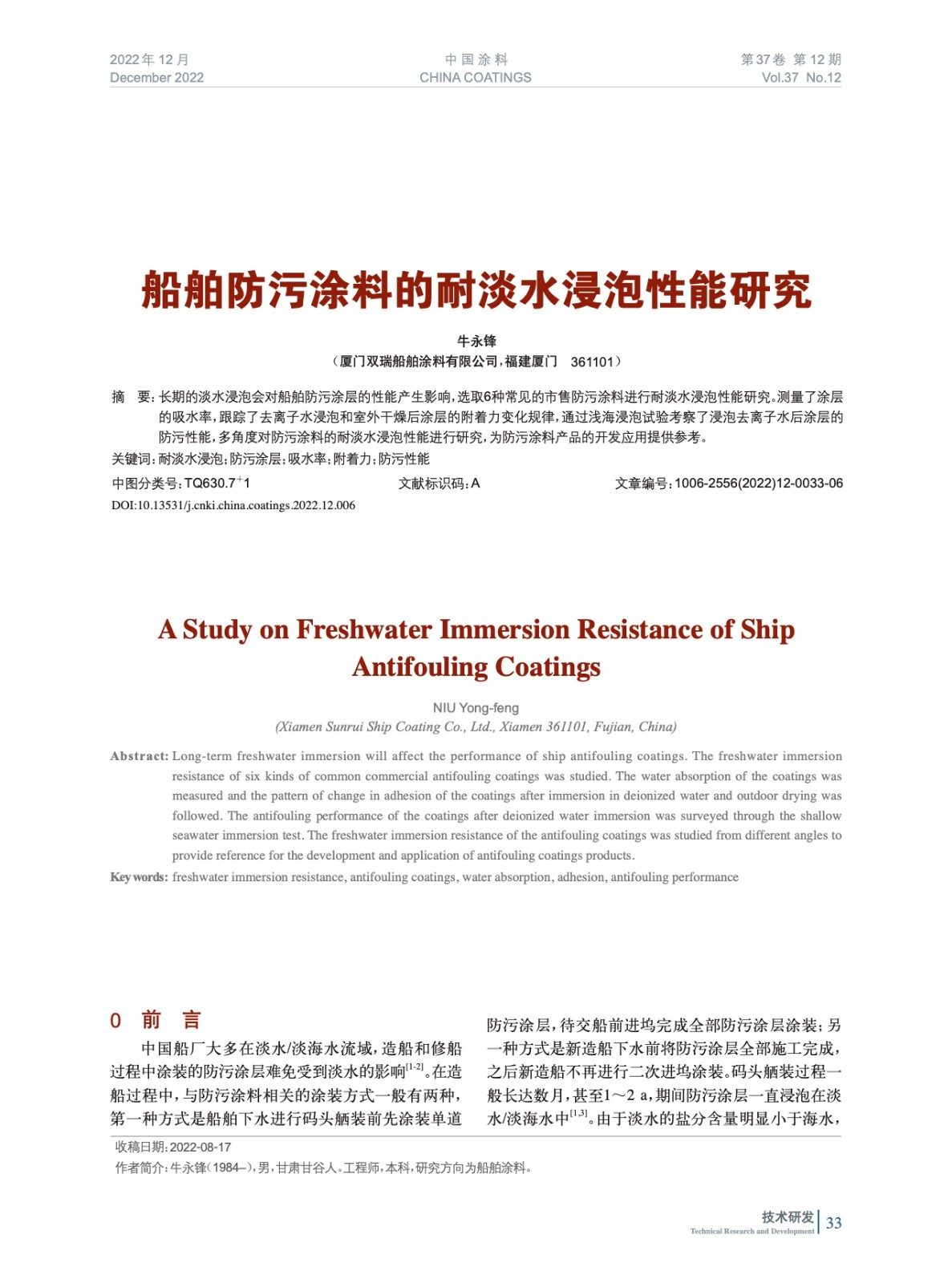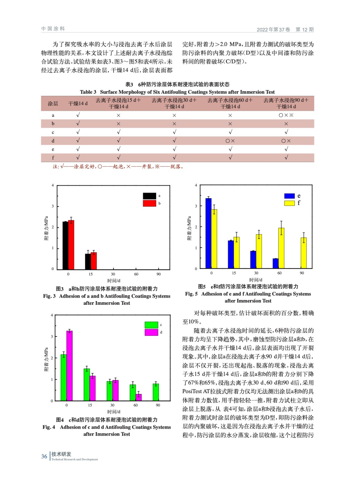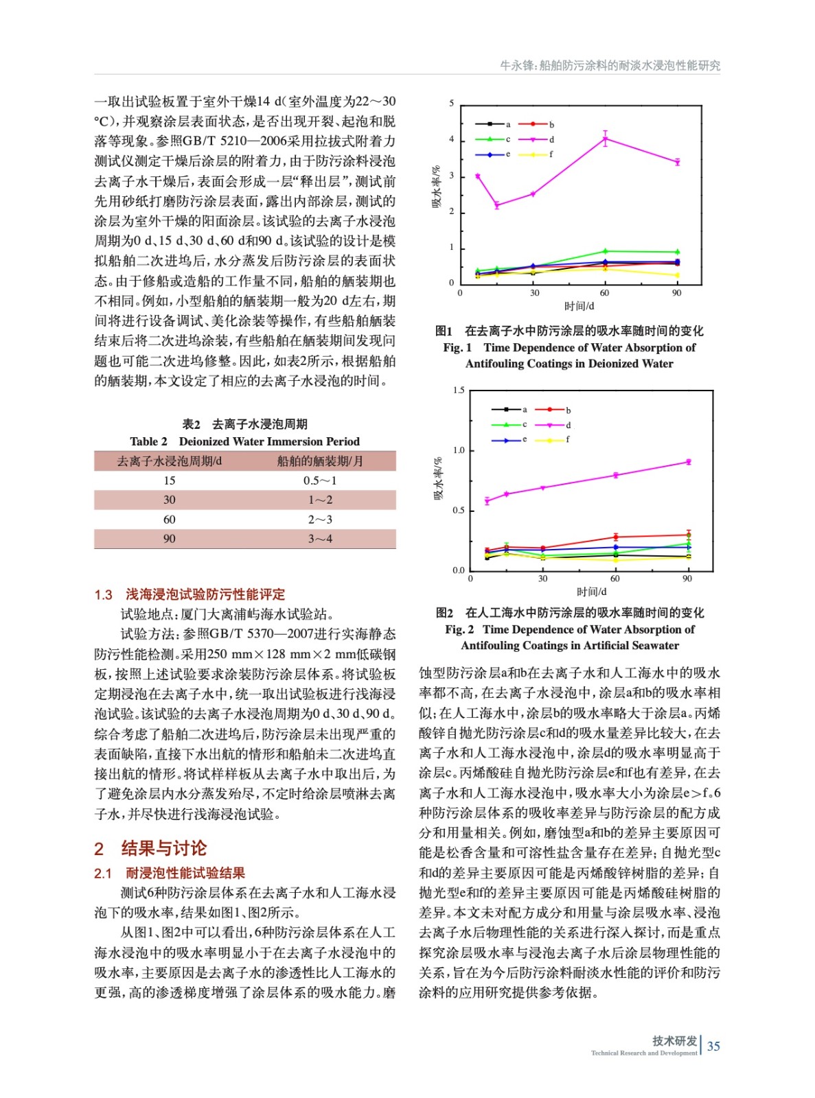 摘要:長期的淡水浸泡會對船舶防污涂層的性能產(chǎn)生影響,選取6種常見的市售防污涂料進行耐淡水浸泡性能研究。測量了涂層的吸水率,跟蹤了去離子水浸泡和室外干燥后涂層的附著力變化規(guī)律,通過淺海浸泡試驗考察了浸泡去離子水后涂層的防污性能,多角度對防污涂料的耐淡水浸泡性能進行研究,為防污涂料產(chǎn)品的開發(fā)應用提供參考。