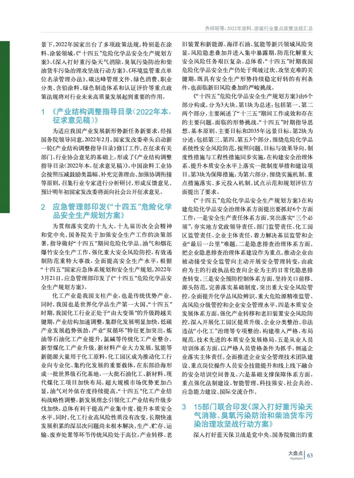 摘要:編者按:在環(huán)境保護(hù)、污染防治、安全生產(chǎn)和產(chǎn)業(yè)結(jié)構(gòu)調(diào)整的政策背景下,2022年國家出臺了多項(xiàng)政策法規(guī),特別是在涂料、涂裝領(lǐng)域,《“十四五”危險化學(xué)品安全生產(chǎn)規(guī)劃方案》、《深入打好重污染天氣消除、臭氧污染防治和柴油貨車污染治理攻堅(jiān)戰(zhàn)行動方案》、《環(huán)境監(jiān)管重點(diǎn)單位名錄管理辦法》、碳達(dá)峰管理文件、綠色消費(fèi)、職業(yè)分類、含鉛涂料、綠色制造體系和認(rèn)證評價等重點(diǎn)政策法規(guī)將對行業(yè)未來高質(zhì)量發(fā)展起到重要的作用。