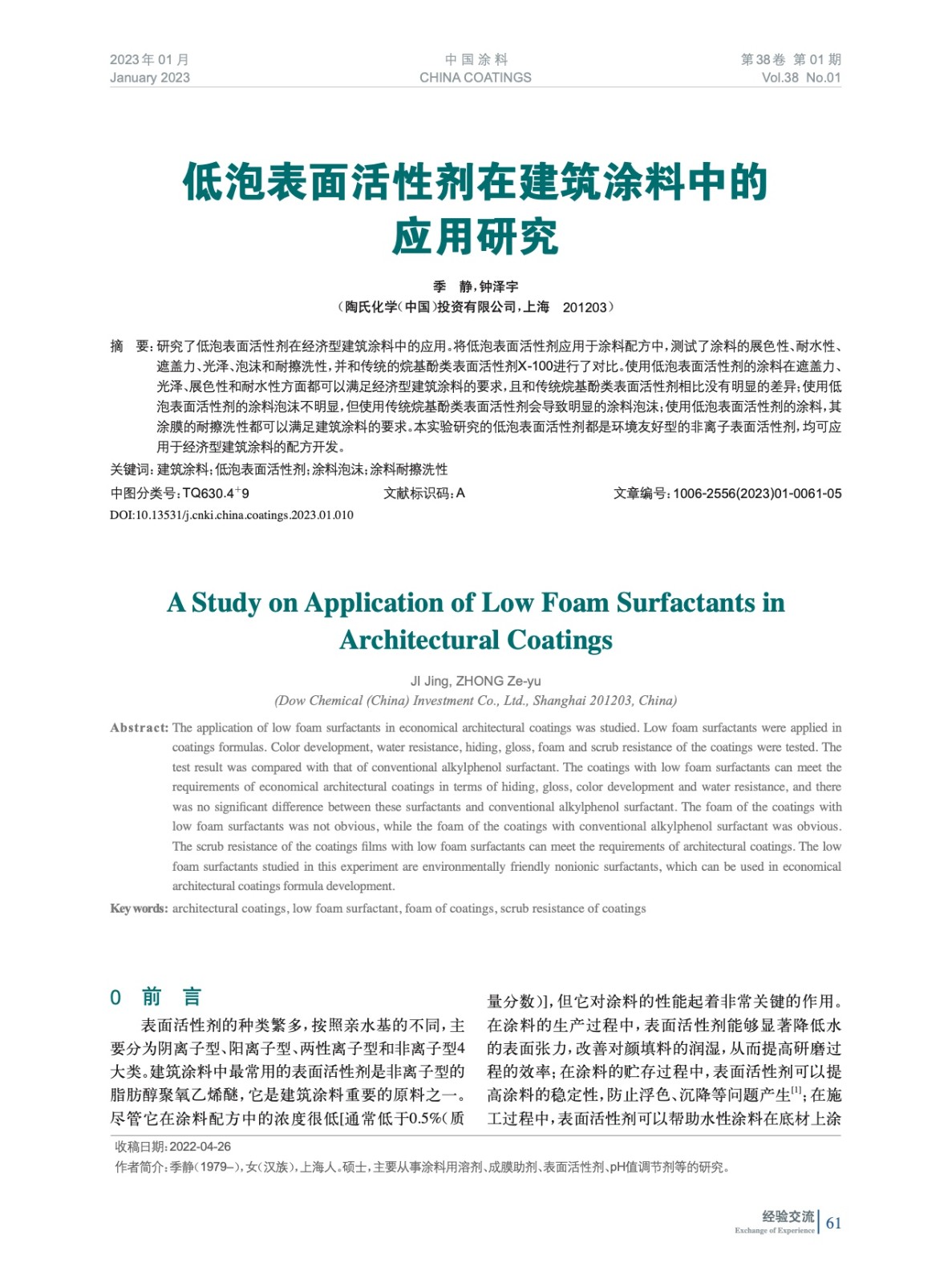 低泡表面活性劑在建筑涂料中的應(yīng)用研究
