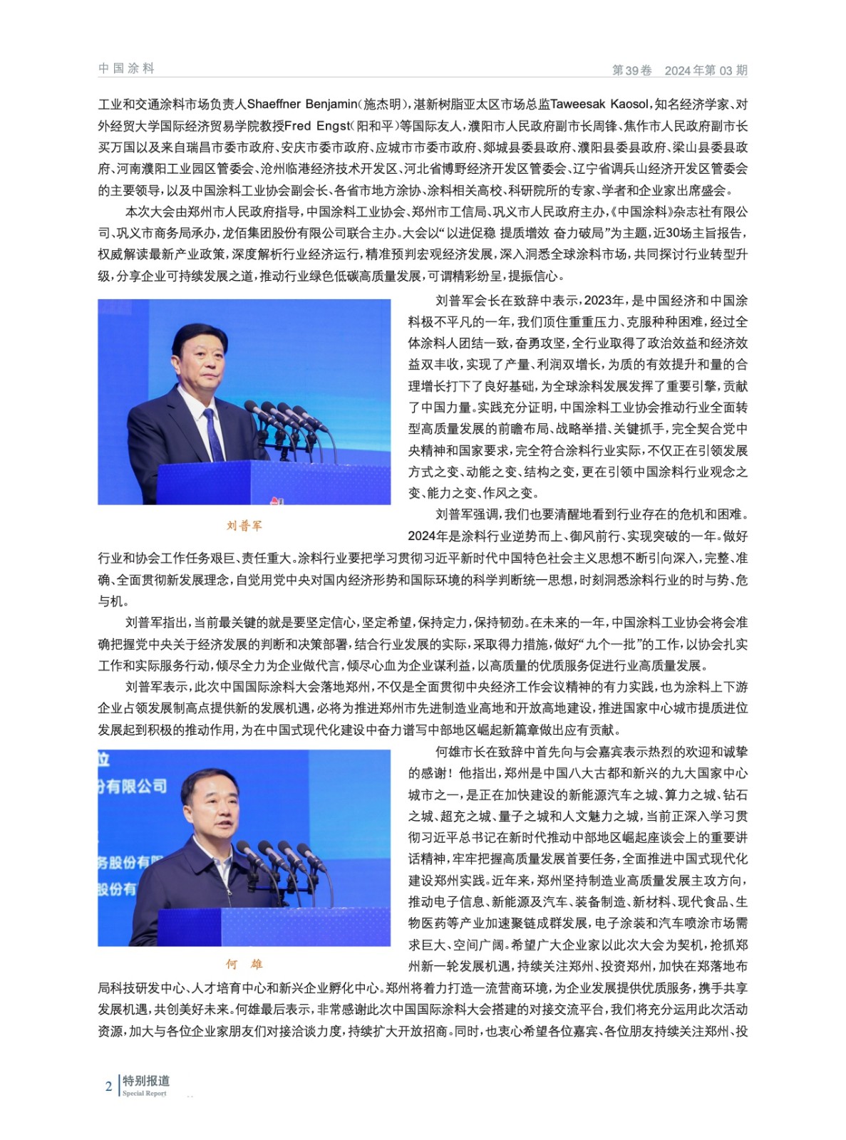 編者按:春滿四澤,萬象更新。2024年3月26-28日,在社會各界和涂料全產業鏈的熱切期盼和矚目下,2024中國國際涂料大會在國家中心城市鄭州盛大召開。來自國家部委、地方政府領導、專家學者、涂料上下游產業鏈企業約1 530名代表參加了本次大會。