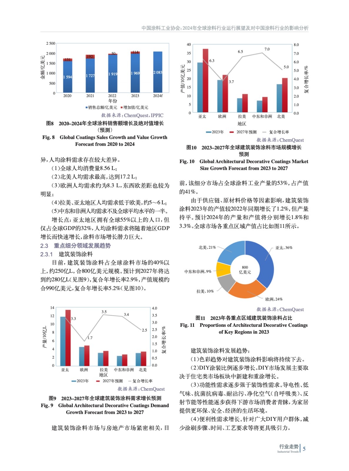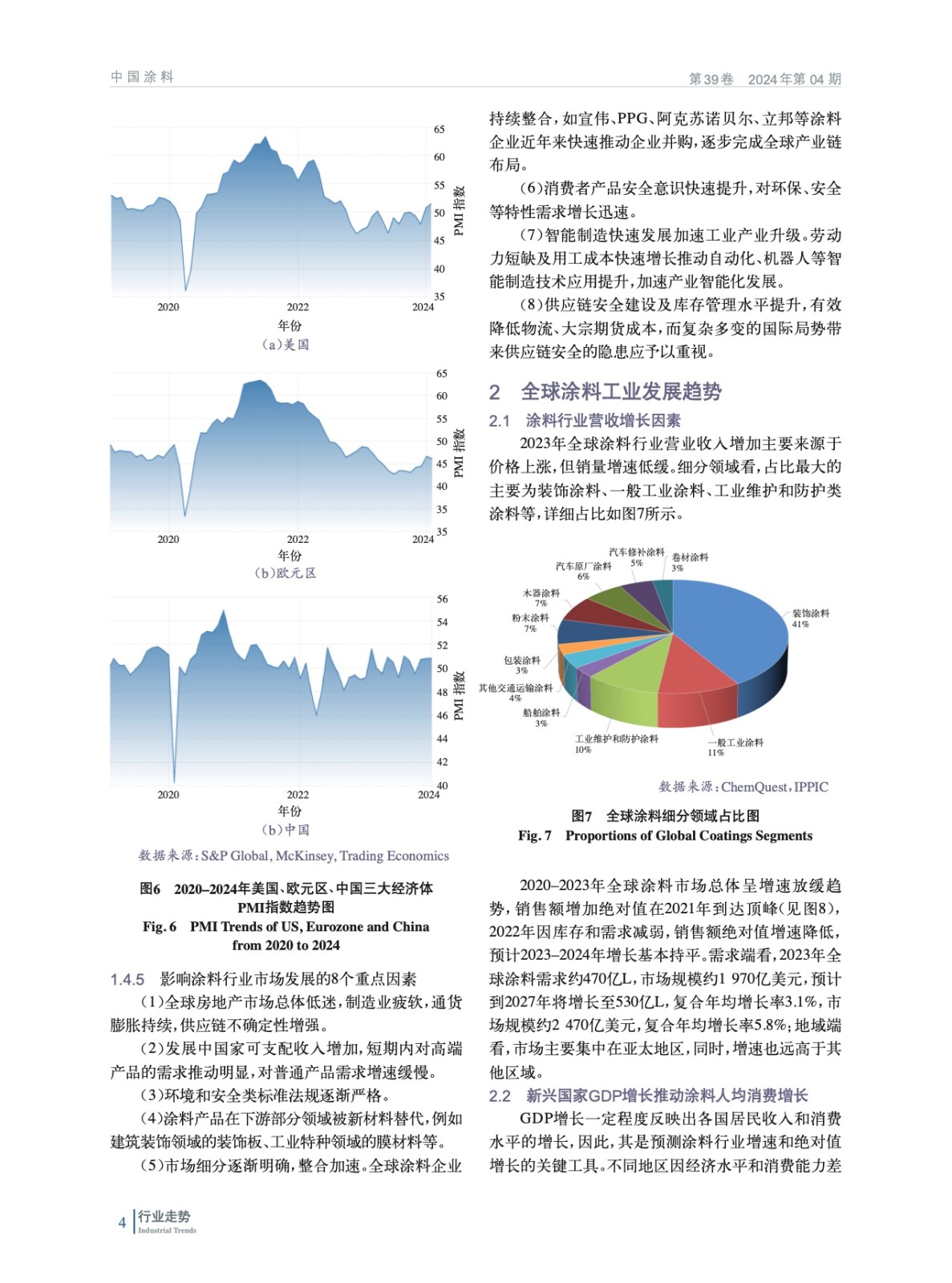 摘要:綜述了全球經(jīng)濟(jì)概況、全球通脹和貿(mào)易對于涂料行業(yè)的影響,國際涂料行業(yè)整體動態(tài)。闡述了涂料行業(yè)營收增長因素、新興國家GDP增長推動涂料人均消費(fèi)增長概況,著重分析了建筑裝飾涂料、原廠涂料、特種與防護(hù)涂料等重點(diǎn)涂料細(xì)分領(lǐng)域發(fā)展趨勢。并從全球經(jīng)濟(jì)發(fā)展重要驅(qū)動方向?qū)θ蛲苛瞎I(yè)未來發(fā)展進(jìn)行了展望。