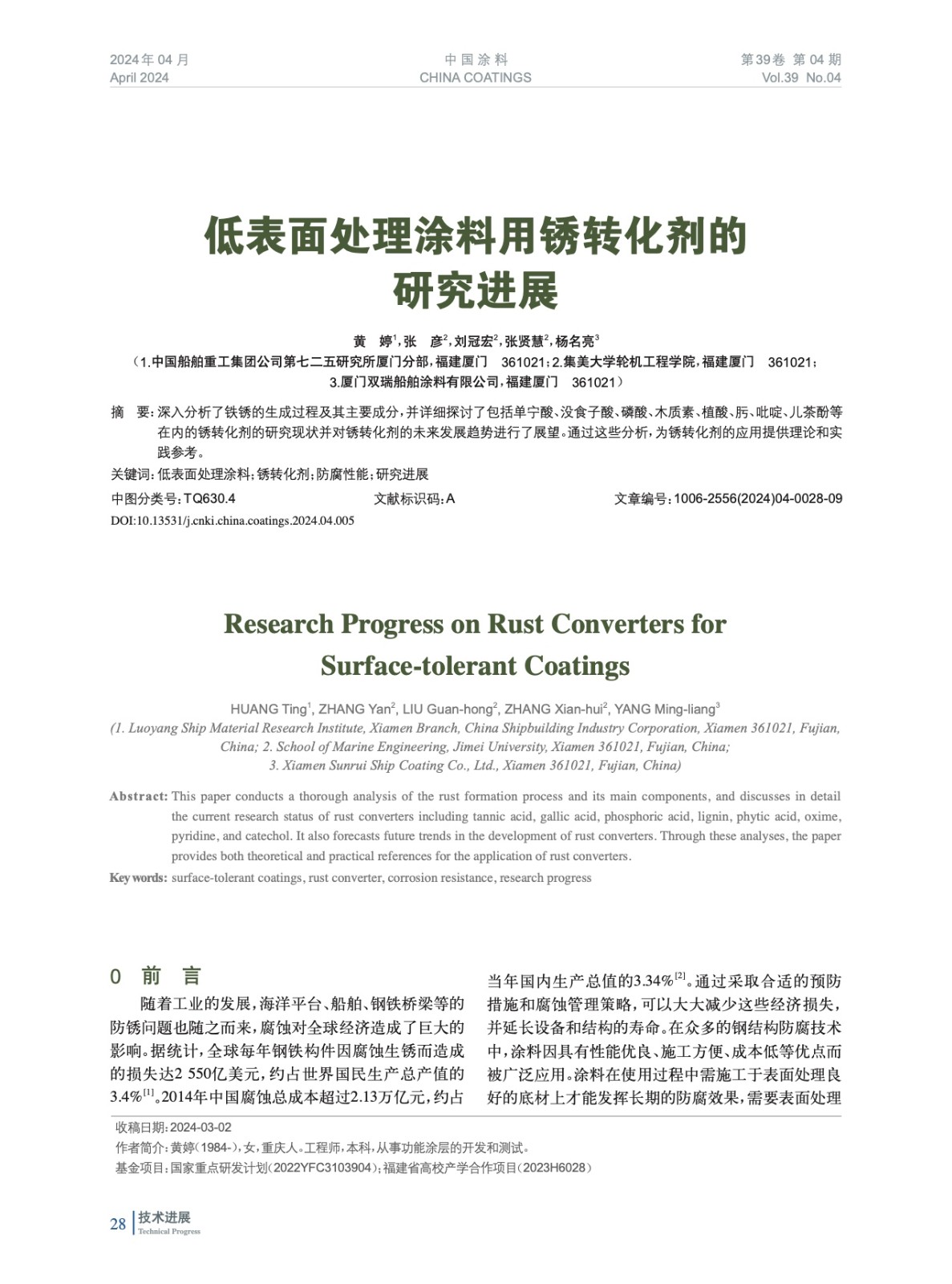 本文系作者@黃 婷,張 彥,劉冠宏,張賢慧,楊名亮 授權中國涂料網發表,并經中國涂料網編輯,未經允許不得轉載,如需轉載請聯系chinacoatingnet@vip.163.com