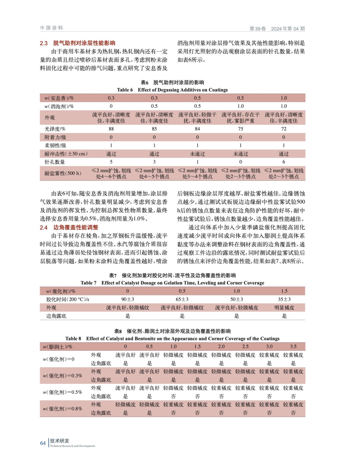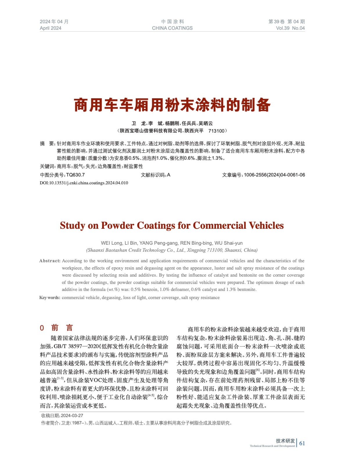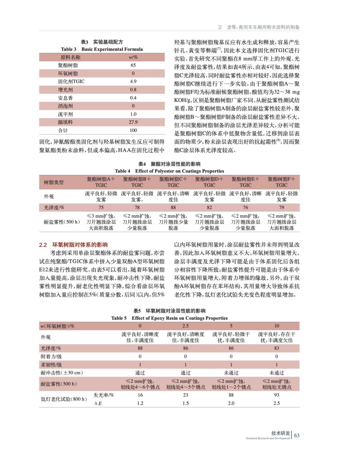 摘要:針對商用車作業(yè)環(huán)境和使用要求、工件特點,通過對樹脂、助劑等的選擇,探討了環(huán)氧樹脂、脫氣劑對涂層外觀、光澤、耐鹽霧性能的影響,并通過測試催化劑及膨潤土對粉末涂層邊角覆蓋性的影響,制備了適合商用車車廂用粉末涂料,配方中各助劑最佳用量(質(zhì)量分?jǐn)?shù))為安息香0.5%、消泡劑1.0%、催化劑0.6%、膨潤土1.3%。