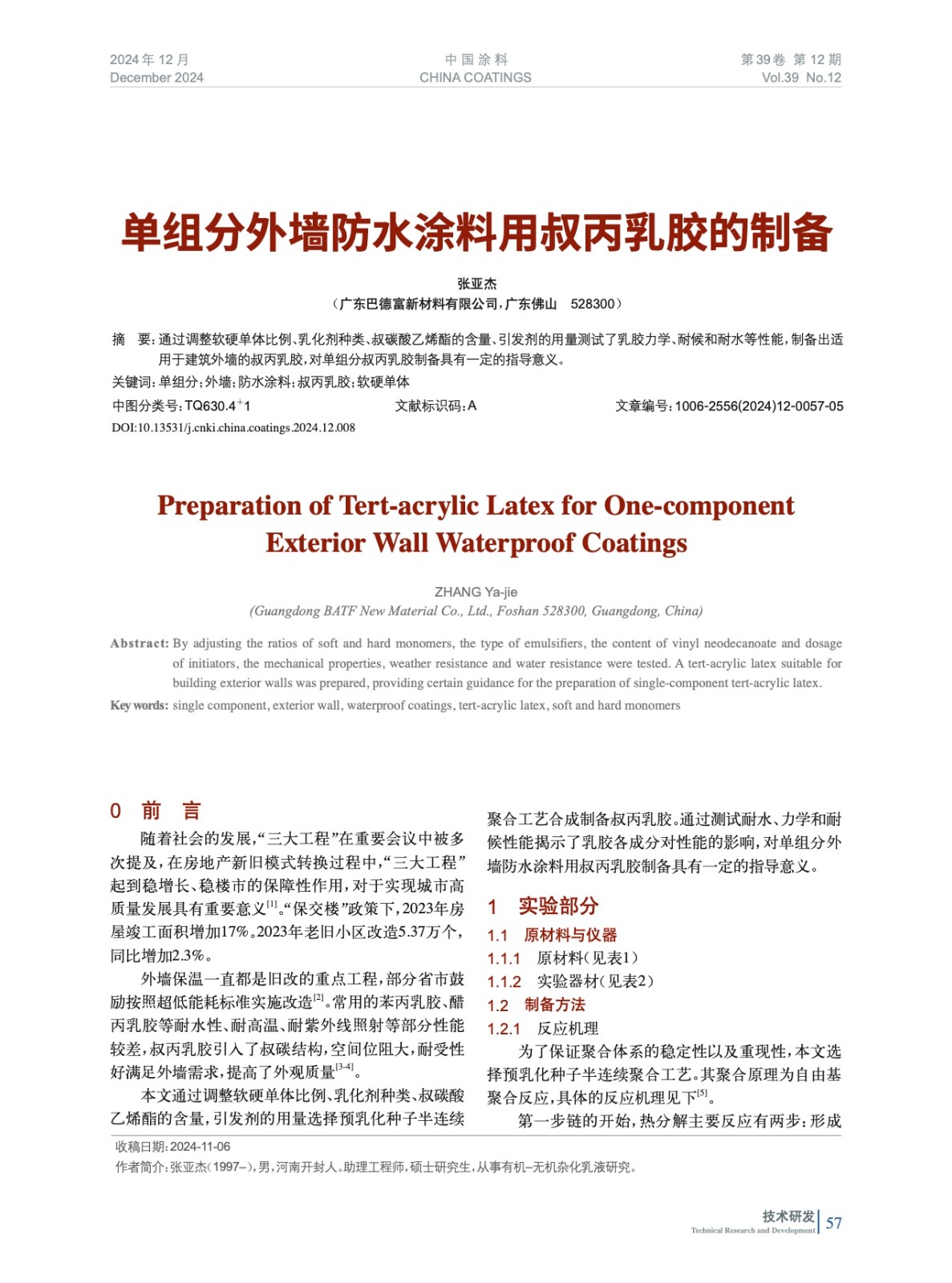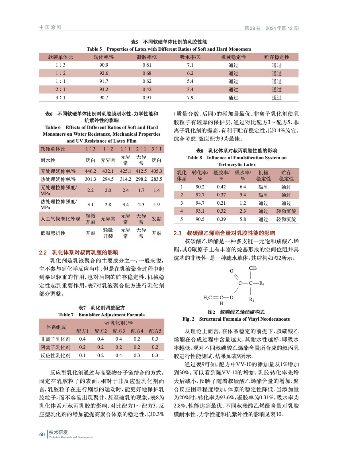 通過調整軟硬單體比例、乳化劑種類、叔碳酸乙烯酯的含量、引發劑的用量測試了乳膠力學、耐候和耐水等性能,制備出適用于建筑外墻的叔丙乳膠,對單組分叔丙乳膠制備具有一定的指導意義。