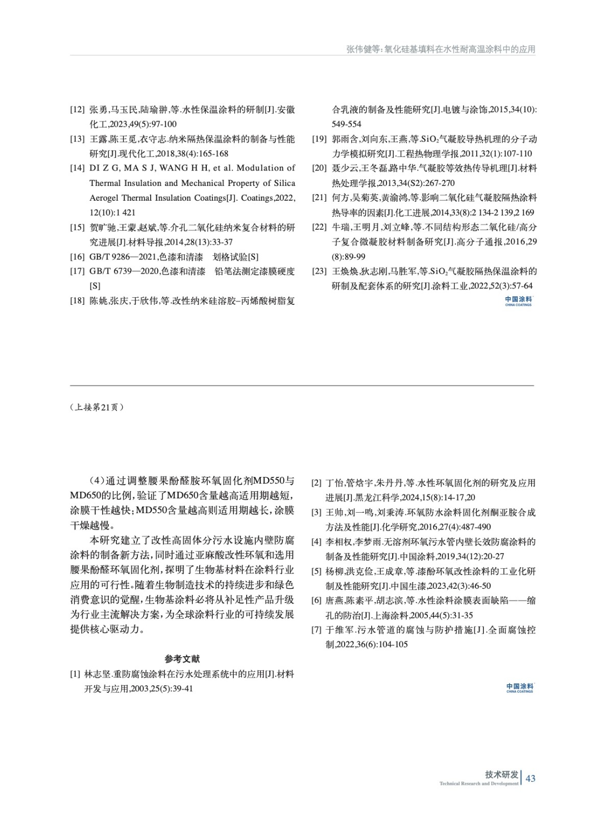 摘要:采用亞麻酸改性環(huán)氧樹(shù)脂和酚醛環(huán)氧樹(shù)脂復(fù)合為成膜物質(zhì),搭配腰果酚醛胺環(huán)氧固化劑制備了改性高固體分污水設(shè)施內(nèi)壁防腐涂料,并詳述了關(guān)鍵創(chuàng)新點(diǎn)亞麻酸改性環(huán)氧樹(shù)脂液和鈦白粉微溶膠液的制備工藝。驗(yàn)證了亞麻酸改性環(huán)氧樹(shù)脂可以提升涂膜附著力;驗(yàn)證了鈦白粉微溶膠液對(duì)涂膜抗藻類(lèi)附著與滋生有積極作用;驗(yàn)證了改性高固體分污水設(shè)施內(nèi)壁防腐涂料搭配腰果酚醛胺環(huán)氧固化劑,涂膜耐鹽霧性能更好;探討了適合不同施工工況下適用期的腰果酚醛胺環(huán)氧固化劑MD550與MD650的比例。