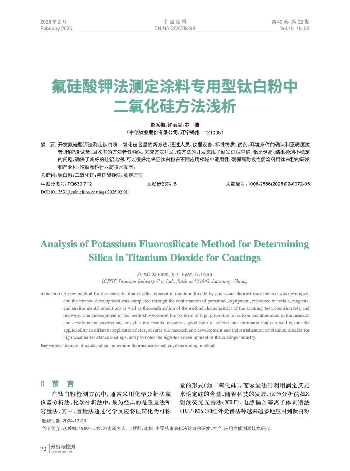 摘要:開發(fā)氟硅酸鉀法測定鈦白粉二氧化硅含量的新方法,通過人員、儀器設(shè)備、標(biāo)準(zhǔn)物質(zhì)、試劑、環(huán)境條件的確認(rèn)和正確度試驗(yàn)、精密度試驗(yàn)、回收率的方法特性確認(rèn),完成方法開發(fā)。該方法的開發(fā)克服了研發(fā)過程中硅、鋁比例高、結(jié)果檢測不穩(wěn)定的問題,確保了良好的硅鋁比例,可以很好地保證鈦白粉在不同應(yīng)用領(lǐng)域中適用性,確保高耐候性能涂料用鈦白粉的研發(fā)和產(chǎn)業(yè)化,推動涂料行業(yè)高技術(shù)發(fā)展。