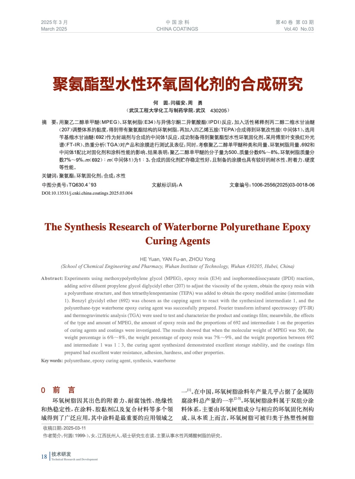 摘要:用聚乙二醇單甲醚(MPEG)、環氧樹脂(E34)與異佛爾酮二異氰酸酯(IPDI)反應,加入活性稀釋劑丙二醇二縮水甘油醚(207)調整體系的黏度,得到帶有聚氨酯結構的環氧樹脂,再加入四乙烯五胺(TEPA)合成得到環氧改性胺(中間體1),選用芐基縮水甘油醚(692)作為封端劑與合成的中間體1反應,成功制備得到聚氨酯型水性環氧固化劑。采用傅里葉變換紅外光譜(FT-IR)、熱重分析(TGA)對產品和涂膜進行測試及表征;同時,考察聚乙二醇單甲醚種類和用量、環氧樹脂用量、692和中間體1配比對固化劑和涂料性能的影響。結果表明:聚乙二醇單甲醚的分子量為500、質量分數6%~8%,環氧樹脂質量分數7%~9%,m(692)∶m(中間體1)為1∶3,合成的固化劑貯存穩定性好,且制備的涂膜也具有較好的耐水性、附著力、硬度等性能。