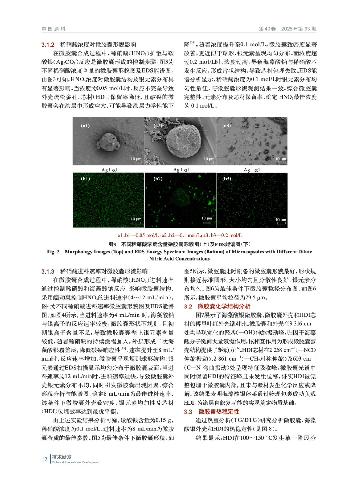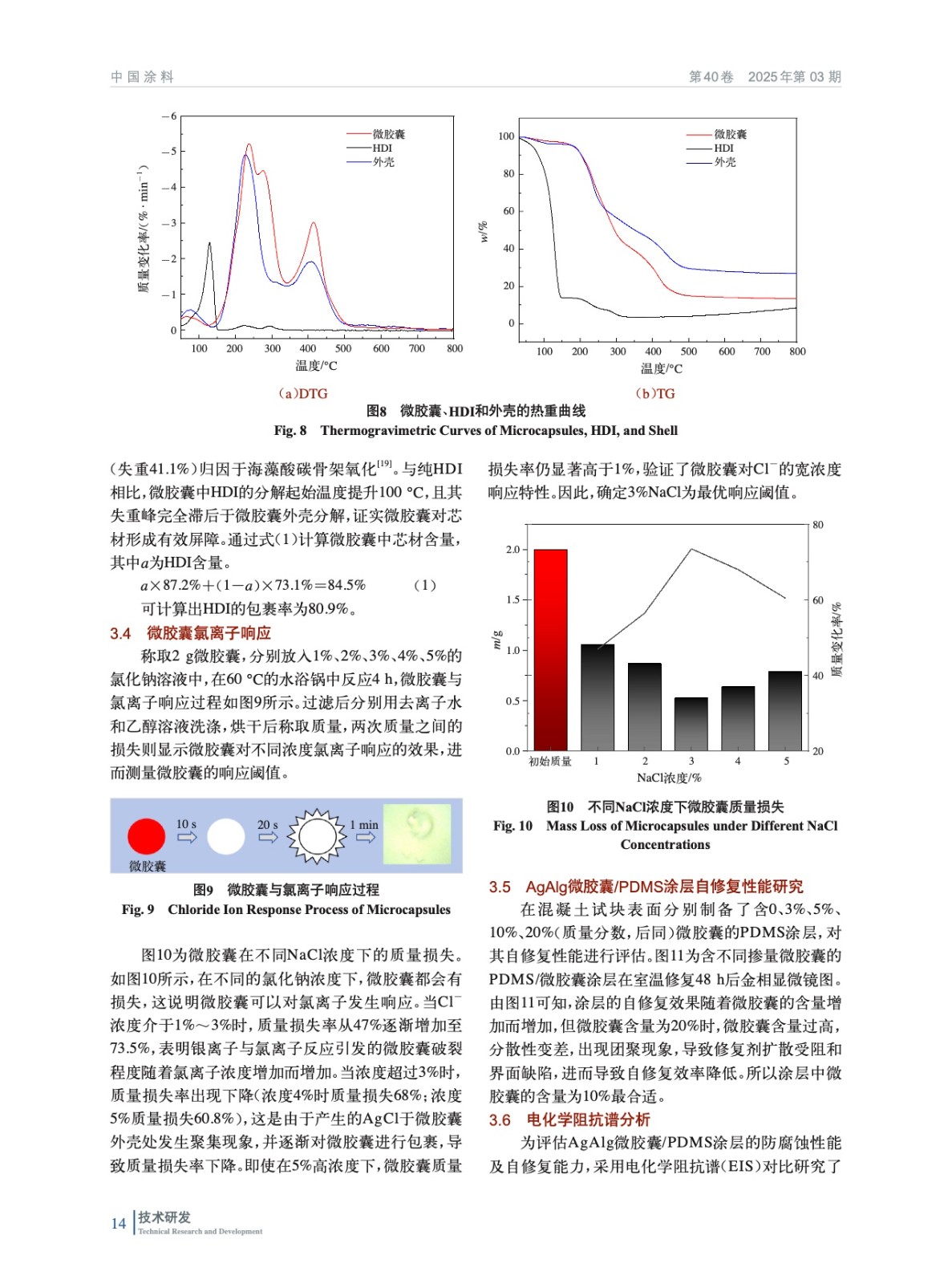 摘要:利用海藻酸鈉為壁材原料,六亞甲基二異氰酸酯為芯材原料,通過內源乳化法制備海藻酸銀(AgAlg)微膠囊,通過控制不同碳酸銀含量和稀硝酸濃度、進料速度探討了微膠囊最佳合成工藝,對微膠囊形貌、化學結構、熱穩定性及芯材含量進行了研究,并通過微膠囊觸發微膠囊響應氯離子濃度進行表征。將微膠囊加入PDMS涂層,制備AgAlg微膠囊/PDMS自修復涂層,對其進行劃痕試驗和電化學阻抗分析,通過與PDMS涂層相對比,結果表明氯離子響應微膠囊具有較強的自修復能力。