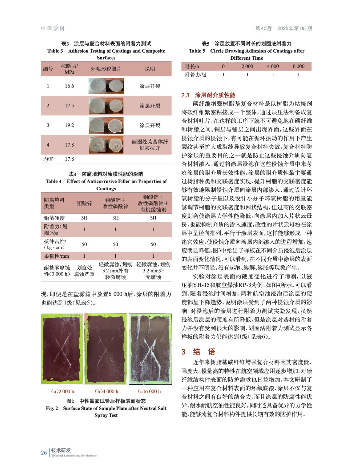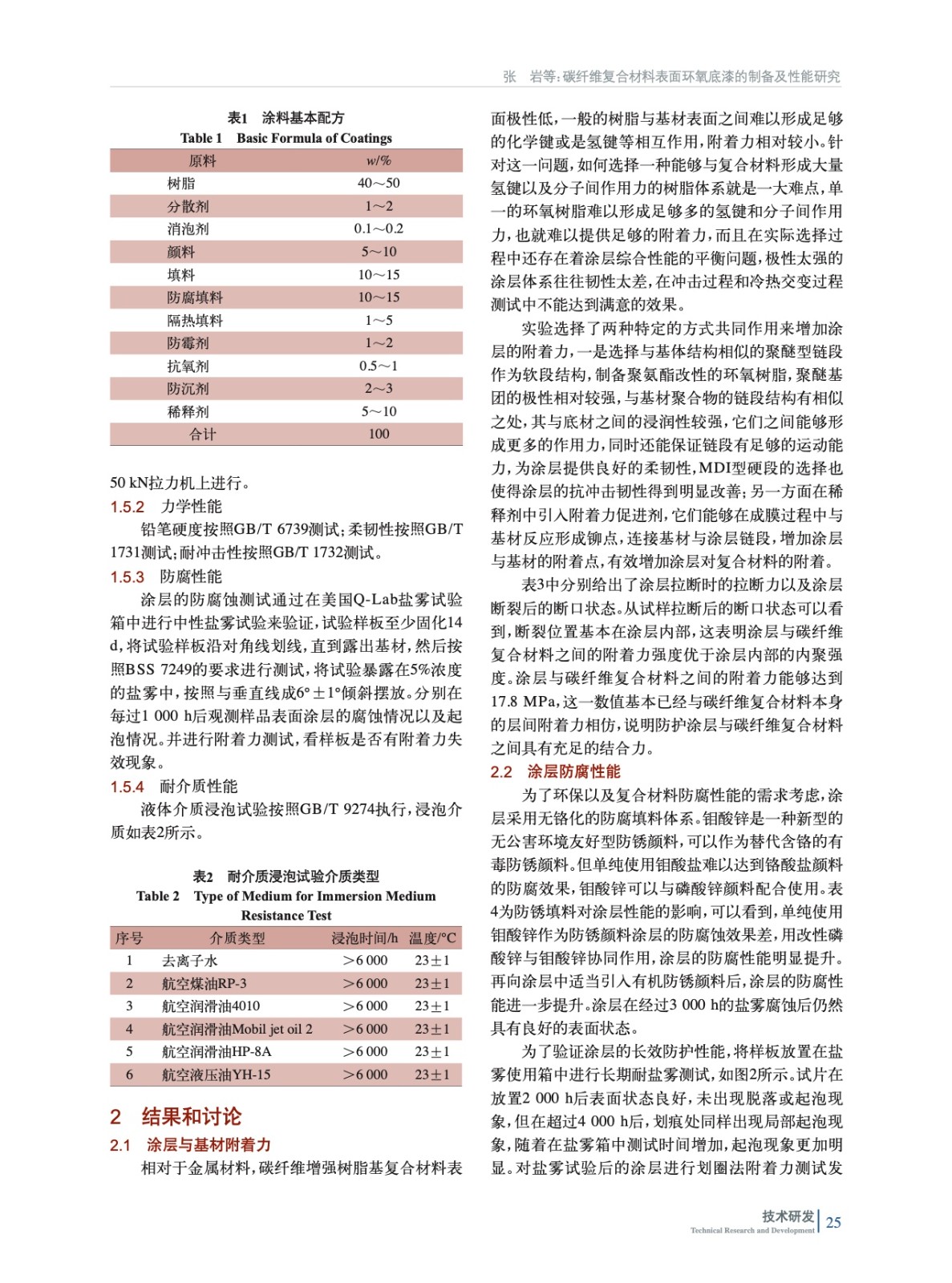 制備出一種用于碳纖維復合材料表面的環氧底漆,并對涂層與復合材料之間的結合力進行了研究,分析了涂層的耐介質、防腐蝕等性能,結果表明環氧底漆與復合材料之間具有良好的結合力,涂層具有優良的綜合性能,對碳纖維復合材料有優秀的防護作用。
