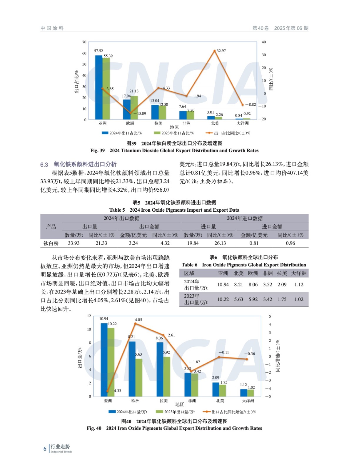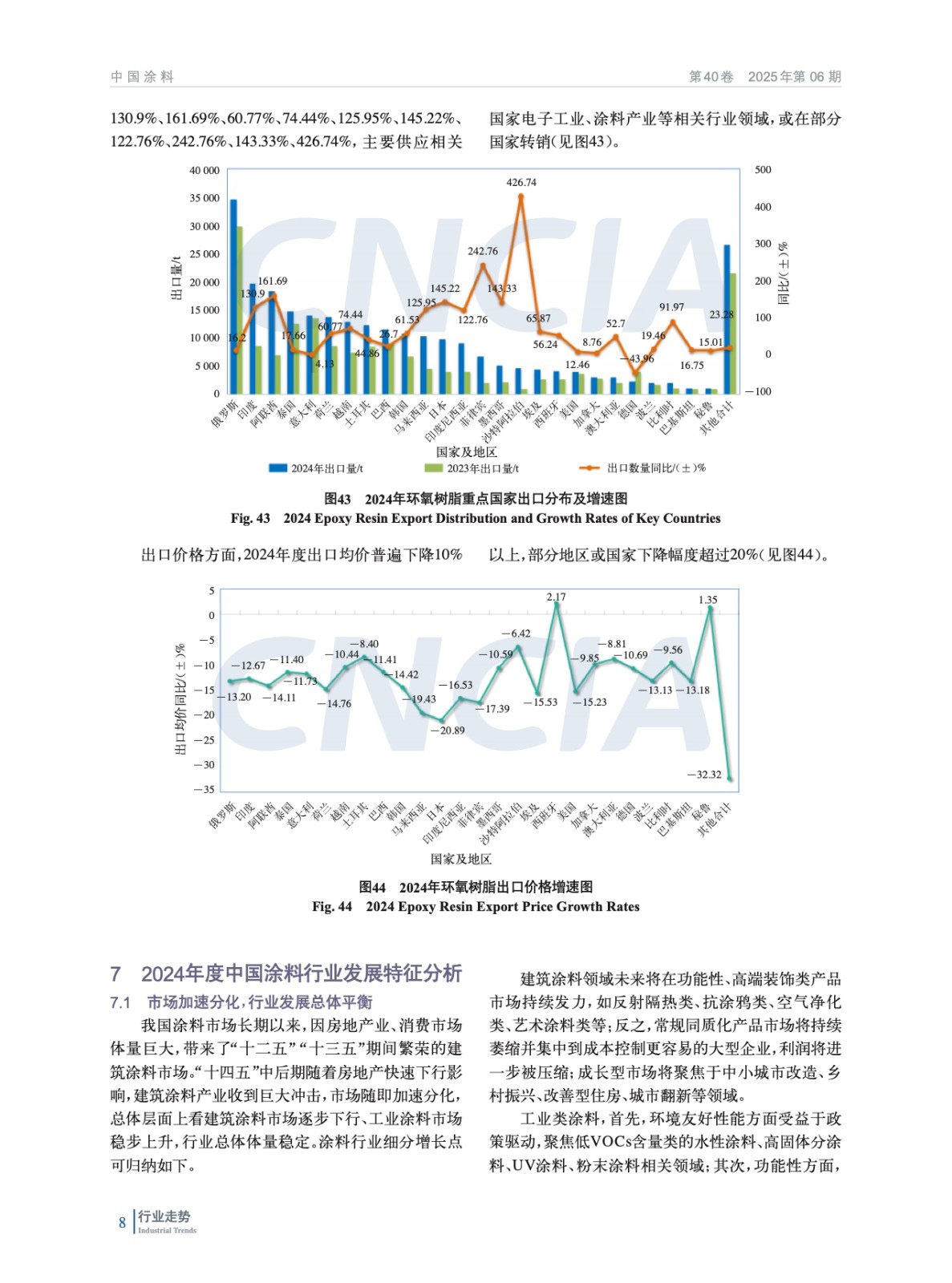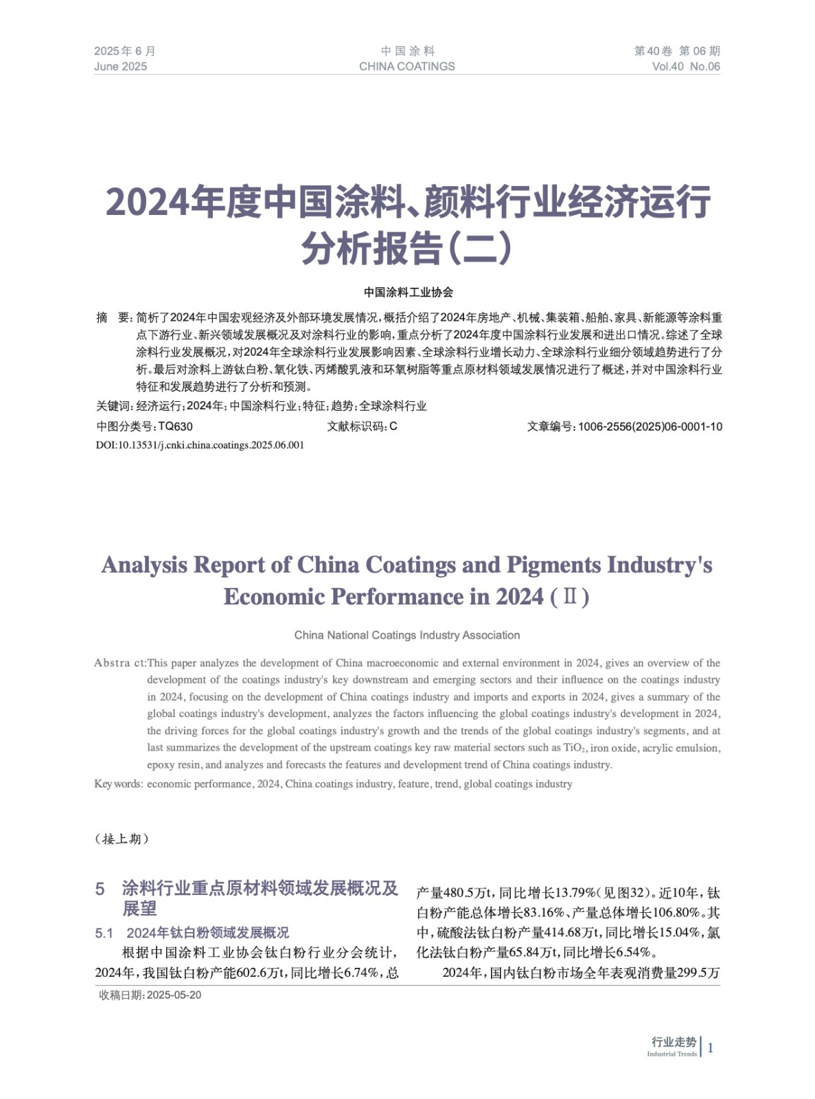 摘要:簡析了2024年中國宏觀經濟及外部環境發展情況,概括介紹了2024年房地產、機械、集裝箱、船舶、家具、新能源等涂料重點下游行業、新興領域發展概況及對涂料行業的影響,重點分析了2024年度中國涂料行業發展和進出口情況。綜述了全球涂料行業發展概況,對2024年全球涂料行業發展影響因素、全球涂料行業增長動力、全球涂料行業細分領域趨勢進行了分析。最后對涂料上游鈦白粉、氧化鐵、丙烯酸乳液和環氧樹脂等重點原材料領域發展情況進行了概述,并對中國涂料行業特征和發展趨勢進行了分析和預測。