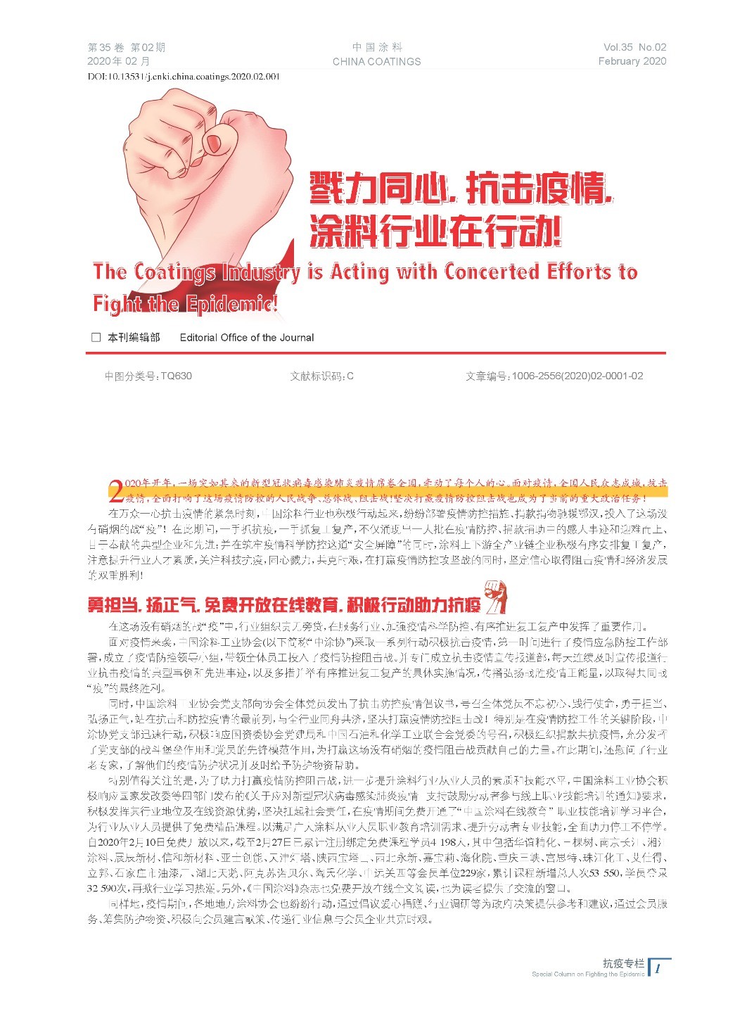 編者按:2020年開年,一場突如其來的新型冠狀病毒感染肺炎疫情席卷全國,牽動了每個人的心。在萬眾一心抗擊疫情的緊急時刻,中國涂料行業也積極行動起來,紛紛部署疫情防控措施、捐款捐物馳援鄂漢,投入了這場沒有硝煙的戰“疫”!