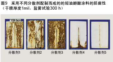 前面提到,制備低VOC醇酸涂料的技術往往會犧牲涂料的性能,例如會降低涂料的光澤、附著力及防腐性。表6給出了市售水性醇酸涂料與增強型水性醇酸樹脂分散體涂料的性能對比。很明顯,所有市售水性醇酸涂料的光澤較、附著力均要比增強型水性醇酸分散體制備的涂料要低和差。硬度和抗沖擊性的數據相當,而采用中油醇酸樹脂分散體制成的涂料抗沖擊性尤為優異。不出所料,與親水改性樹脂制備的的涂料相比,由未改性的疏水型醇酸樹脂制備的涂料的防腐性較好。圖12對增強型水性醇酸樹脂分散體制備的涂料與市售水性醇酸涂料經300 h鹽霧試驗后的耐腐蝕性進行了對比。短油醇酸分散體制備的涂料的性能明顯優于其它所有的市售水性醇酸乳膠涂料,與 VOC>300 g/L的水稀釋性醇酸涂料的性能相當,但提高了防腐性能。