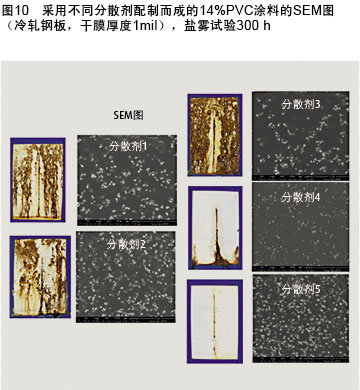 例如,在研磨料中加入五種不同的分散劑進行試驗評估,發現涂料的防腐性出現截然不同的結果(圖9)。為了深入了解這一結果的原因,采用SEM分析對涂料進行評估(圖10),結果令人震驚。當分散劑的疏水性越強時,二氧化鈦在醇酸樹脂涂料中的分散越好,從而防腐性能更好。因此必須選擇恰當的助劑,這對其他助劑,包括流變改性劑(RM)和消泡劑,也是一樣的。圖11顯示了RM1是如何導致了一個不穩定的涂料配方,而RM2能使涂料增稠,達到一定的黏度,而不會出現絮凝結塊。
