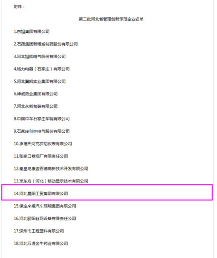 近日,由河北省工業和信息化廳組織開展的省管理創新示范企業創建活動經專家評審并公示,包括河北晨陽工貿集團有限公司在內的18家企業被認定為第二批“河北省管理創新示范企業”。