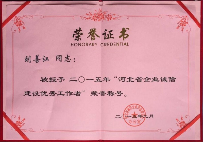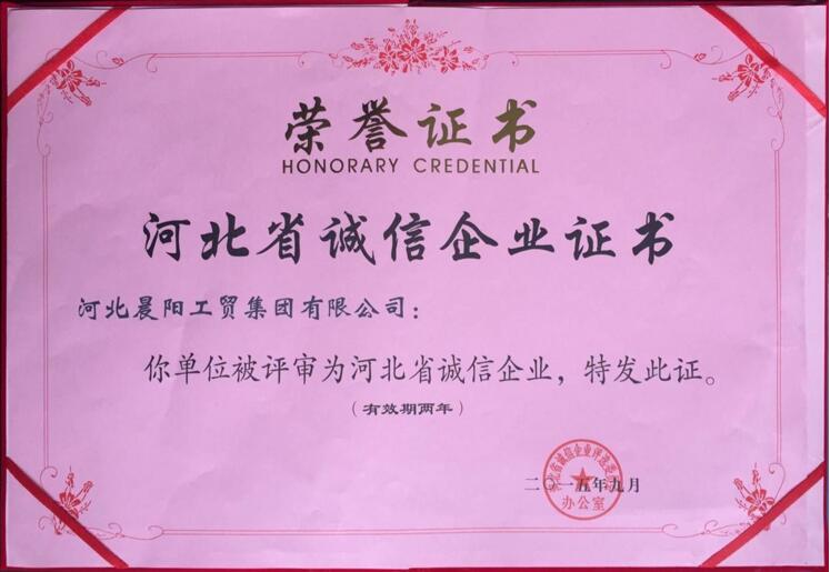 在河北省企業(yè)家協(xié)會等部門聯(lián)合開展的“河北省誠信企業(yè)”評選活動中,河北晨陽工貿(mào)集團(tuán)有限公司被評為2015年“河北省誠信企業(yè)”,董事長劉善江榮獲“河北省企業(yè)誠信建設(shè)優(yōu)秀工作者”稱號。
