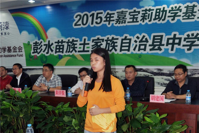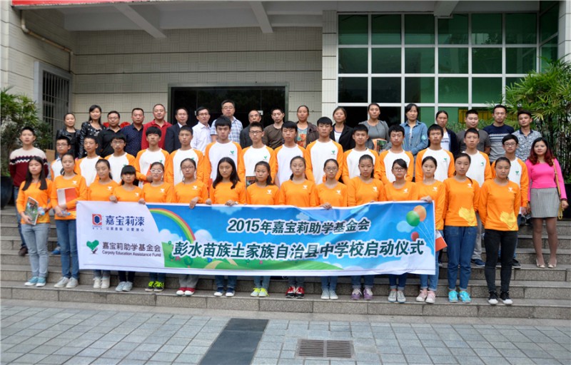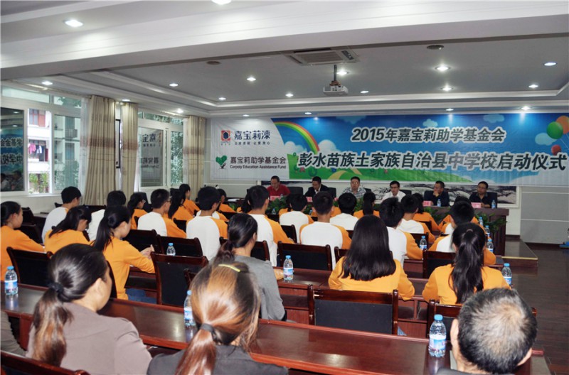 10月21日,2015年嘉寶莉助學(xué)啟動(dòng)儀式在彭水中學(xué)多功能廳舉行,30名來(lái)自烏江下游兩岸的苗族、土家族高一優(yōu)秀貧困學(xué)子喜獲資助。高中三年,他們將獲得嘉寶莉助學(xué)基金會(huì)每人每年2000元的資助。