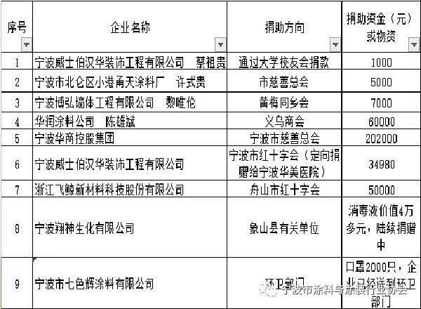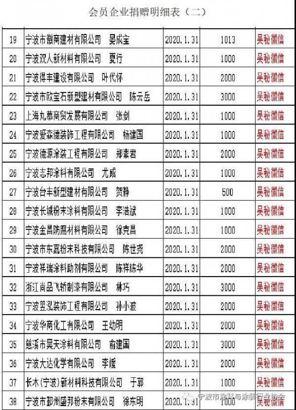協會1月31日發出《抗擊新型冠狀病毒捐款捐物倡議書》后,全體會員企業快速響應,積極捐款捐物,發揚有擔當有責任的企業家情懷和強烈的社會責任感,積極支援疫情防控工作。在這里對大家的善舉表示崇高的敬意!截至2月2日止,協會共收到會員個人捐款141413元;會員企業通過向寧波市紅十字會等途徑直行捐款36萬元;捐贈消毒液價值4萬多元,捐贈口罩2000個等物資。
