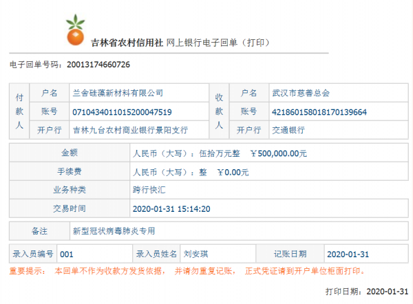 1月31日,蘭舍硅藻新材料有限公司向武漢市慈善總會捐款人民幣50萬元,作為疫情救助??钍褂?,支援武漢抗擊疫情,同舟共濟,共度難關。
