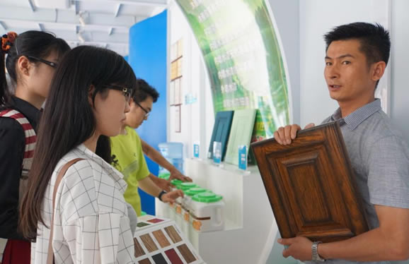 拿起板刷,在樣板上來(lái)回涂抹;風(fēng)干后,學(xué)生們觸摸漆面的質(zhì)地,觀察成品的效果,在實(shí)地研究學(xué)習(xí)水漆涂裝效果。近日,根據(jù)高等教育有關(guān)校企合作走“產(chǎn)、學(xué)、研”相結(jié)合道路的發(fā)展要求,武漢華中科技大學(xué)建筑系14級(jí)學(xué)生前往晨陽(yáng)水漆武漢旗艦店實(shí)地觀摩學(xué)習(xí)水漆的調(diào)配與涂刷過(guò)程。晨陽(yáng)水漆武漢地區(qū)銷(xiāo)售代表王金偉為同學(xué)們進(jìn)行了地坪漆及內(nèi)墻漆種類(lèi)、參數(shù)、施工方法等一系列的培訓(xùn)講解。
