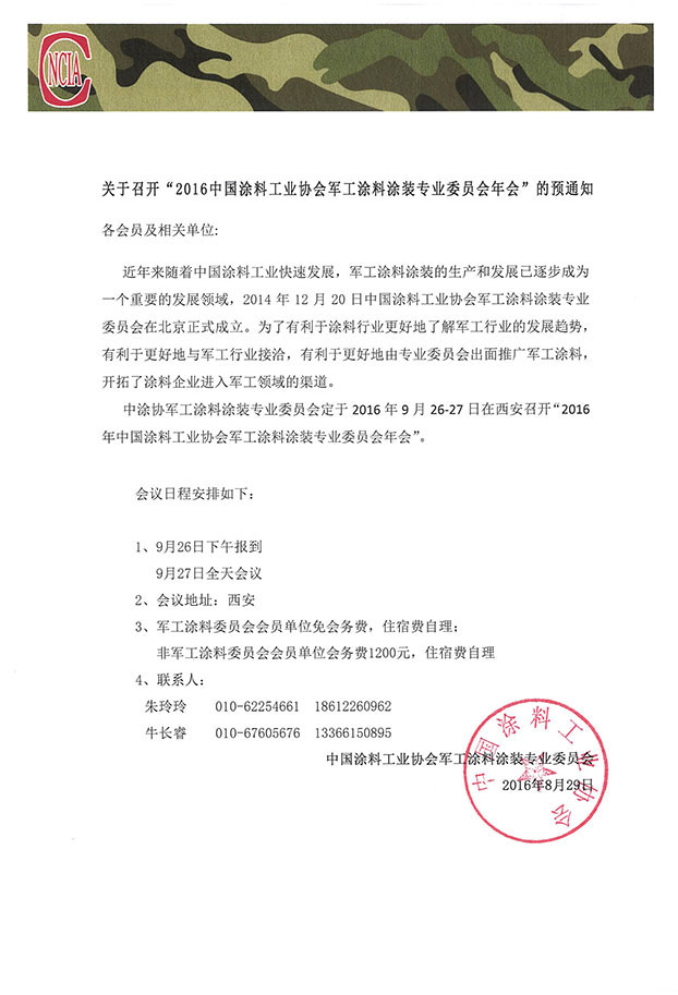 各會(huì)員及相關(guān)單位: 中涂協(xié)軍工涂料涂裝專(zhuān)業(yè)委員會(huì)定于 2016年9月26-27日 在 西安 召開(kāi)“2016年中國(guó)涂料工業(yè)協(xié)會(huì)軍工涂料涂裝專(zhuān)業(yè)委員會(huì)年會(huì)”。 9月27日全天會(huì)議 2、會(huì)議地址:西安 3、軍工涂料委員會(huì)會(huì)員單位免會(huì)務(wù)費(fèi),住宿費(fèi)自理; 非軍工涂料委員會(huì)會(huì)員單位會(huì)務(wù)費(fèi)1200元,住宿費(fèi)自理 4、聯(lián)系人: 朱玲玲 010-62254661 18612260962 牛長(zhǎng)睿 010-67605676 13366150895 中國(guó)涂料工業(yè)協(xié)會(huì)軍工涂料涂裝專(zhuān)業(yè)委員會(huì) 2016年8月29日