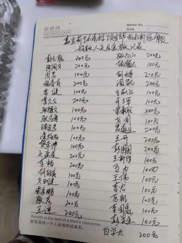 1月31日下午,在項目部負責人彭元聰?shù)某h下,大家踴躍捐款,你兩百,我一百,短短半天時間,項目部90多位員工就籌款1.14萬元,表現(xiàn)出了一方有難、八方支援的大愛精神。