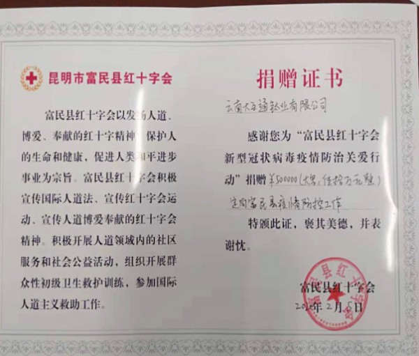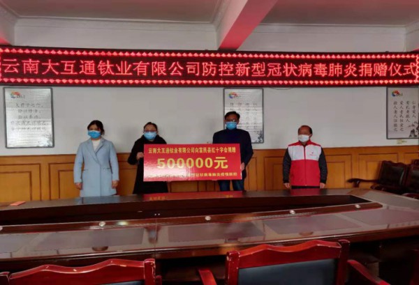 疫情無情人有情,敢于擔當顯真情。在全國上下共同抗擊新型冠狀病毒感染肺炎疫情的關(guān)鍵時刻,2月5日上午,云南大互通鈦業(yè)有限公司向縣紅十字會捐贈愛心善款50萬元,定向用于富民縣應(yīng)對新型冠狀病毒肺炎疫情防控工作,其中:35萬元定向用于7個鎮(zhèn)(街道)的疫情防控工作,各鎮(zhèn)(街道)分別5萬元;15萬元定向用于富民縣應(yīng)對新型冠狀病毒肺炎疫情防控工作。縣紅十字會和縣工商聯(lián)相關(guān)領(lǐng)導(dǎo)參加捐贈儀式,并為愛心企業(yè)頒發(fā)了捐贈證書。