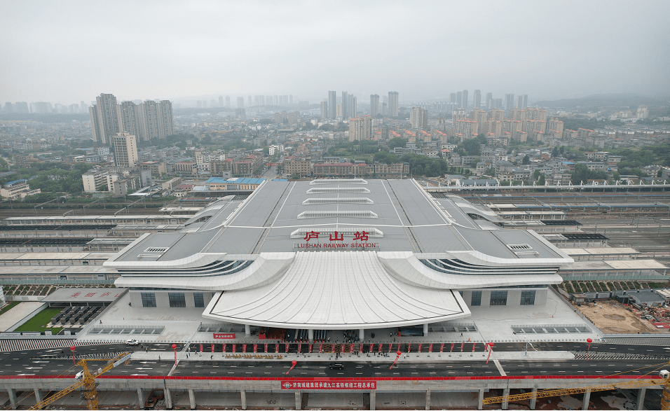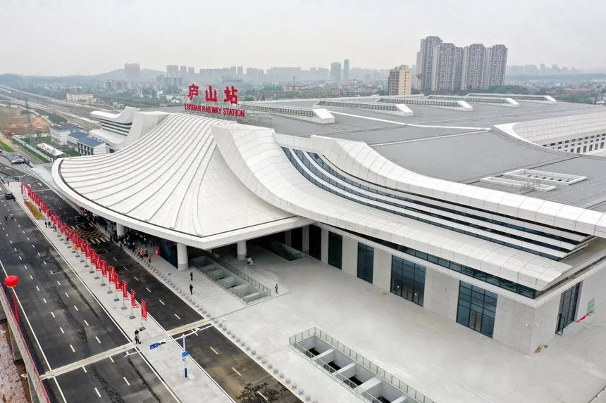 2022年4月底,九江市首座高鐵站——廬山站西站房正式開(kāi)通運(yùn)營(yíng)。站臺(tái)設(shè)計(jì)融入廬山云霧和山水的柔美形態(tài),色彩明快,意境唯美,與遠(yuǎn)處的自然景觀遙相呼應(yīng),于山影水語(yǔ)間大放異彩!