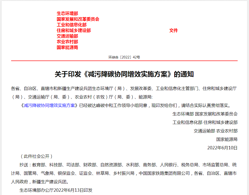 6月10日,生態(tài)環(huán)境部、發(fā)展改革委、工業(yè)和信息化部、住房城鄉(xiāng)建設(shè)部、交通運輸部、農(nóng)業(yè)農(nóng)村部、能源局聯(lián)合印發(fā)《減污降碳協(xié)同增效實施方案》(以下簡稱《方案》),深入貫徹落實黨中央、國務(wù)院關(guān)于碳達峰碳中和決策部署,落實新發(fā)展階段生態(tài)文明建設(shè)有關(guān)要求,對推動減污降碳協(xié)同增效作出系統(tǒng)部署。