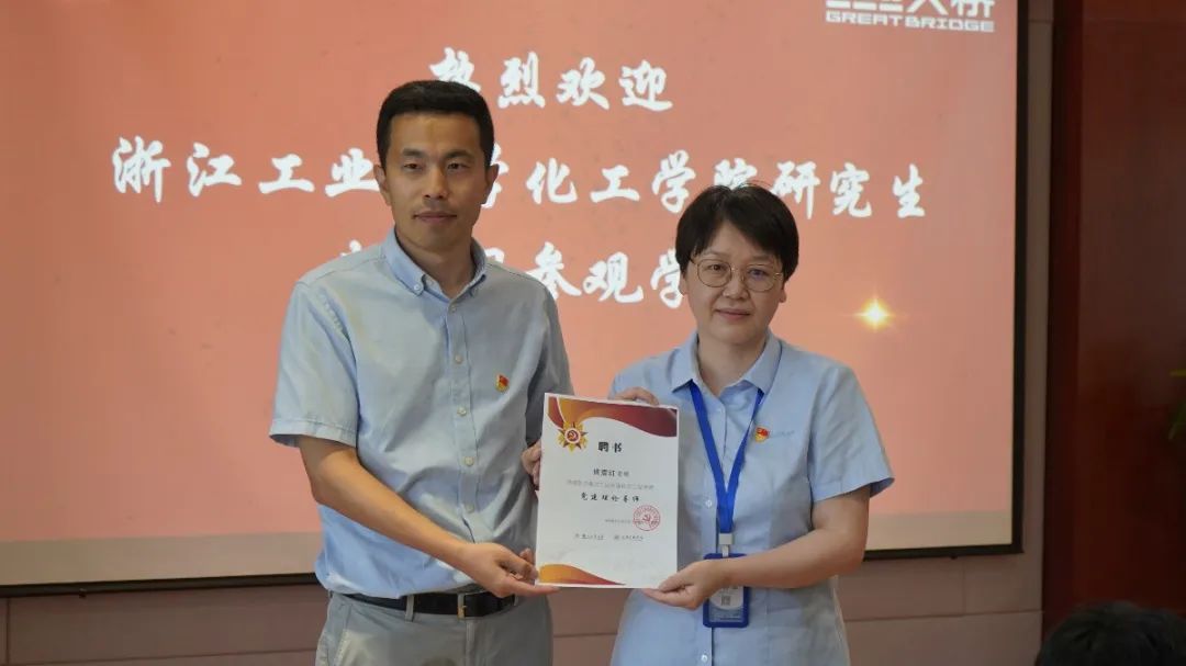 聘任浙江大橋黨委副書(shū)記傅震紅為浙江工業(yè)大學(xué)化工學(xué)院黨建理論導(dǎo)師,由浙江工業(yè)大學(xué)化工學(xué)院劉軍磊老師頒發(fā)聘書(shū)。