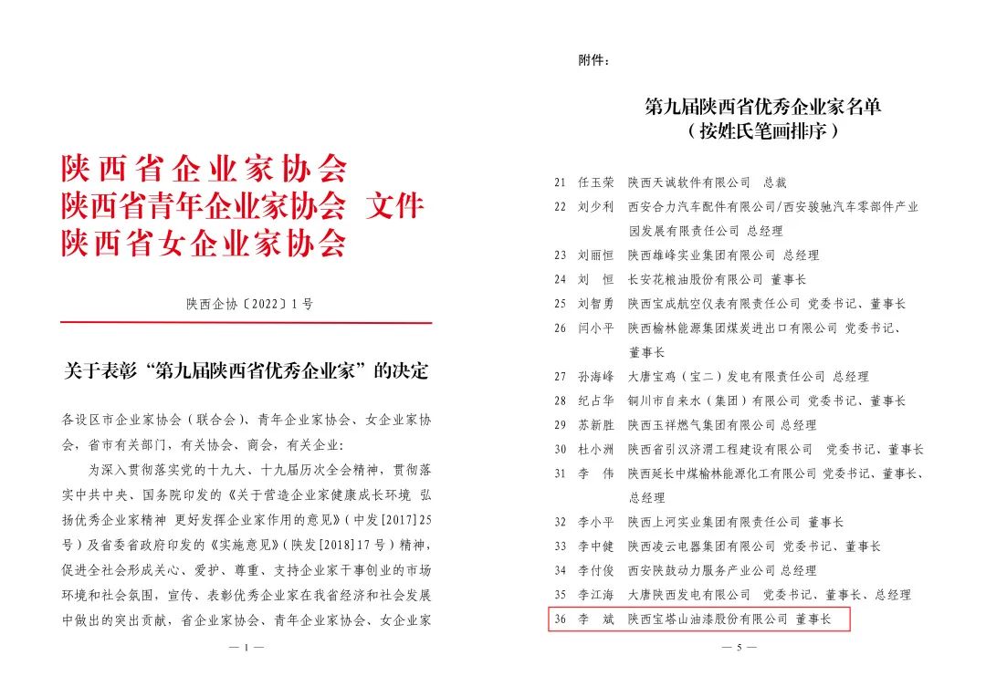 近日,由陜西省企業(yè)家協(xié)會于2021年-2022年在全省范圍內(nèi)聯(lián)合開展的評選“第九屆陜西省優(yōu)秀企業(yè)家”活動落下帷幕,經(jīng)過現(xiàn)場考評、網(wǎng)絡(luò)公示等嚴格考核,在陜西省范圍內(nèi)共評選出84名優(yōu)秀企業(yè)家,陜西寶塔山油漆股份有限公司董事長李斌獲評“第九屆陜西省優(yōu)秀企業(yè)家”稱號。