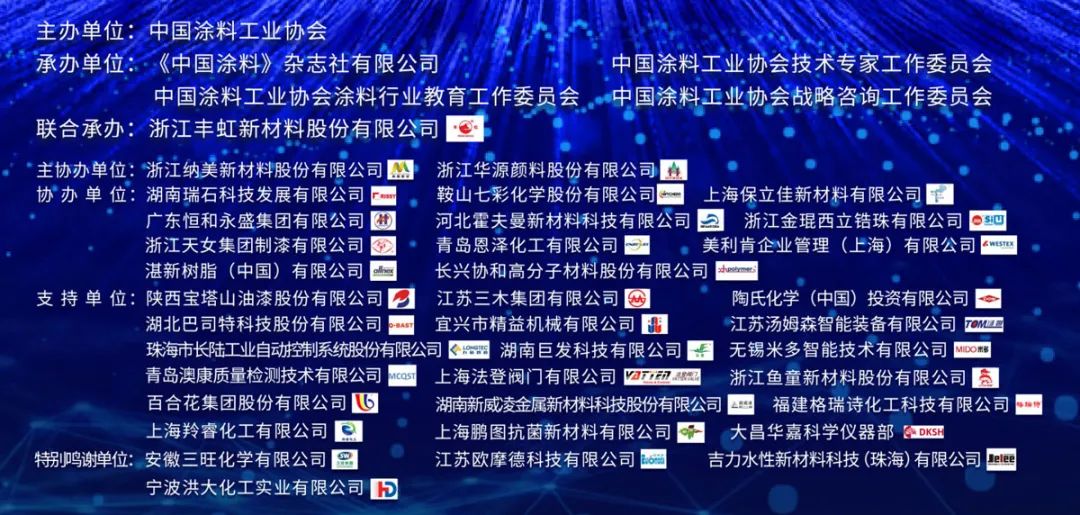 本次大會由中國涂料工業(yè)協(xié)會主辦,浙江豐虹新材料股份有限公司聯(lián)合承辦,浙江納美新材料股份有限公司、浙江華源顏料股份有限公司主協(xié)辦,可謂大咖聚首,群英聚會,特別感謝以下單位的大力支持。